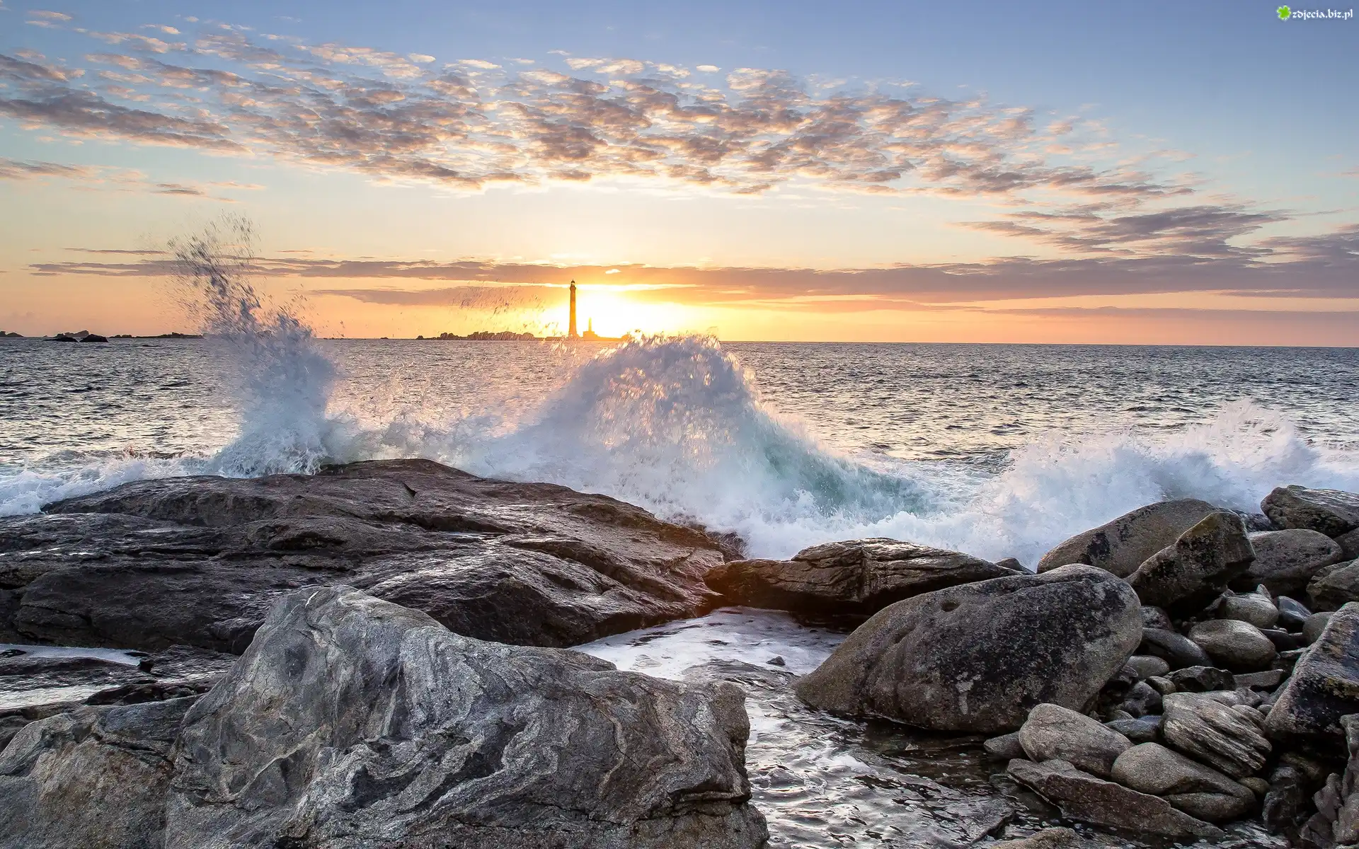 Zdjęcie Morze, Latarnia morska, Fale, Skały, Kamienie, Wschód słońca