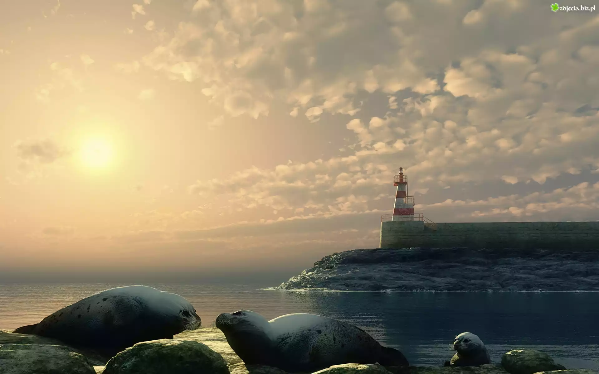 Zdjęcie Latarnia, Morska, Zachód, Słońca, Foki