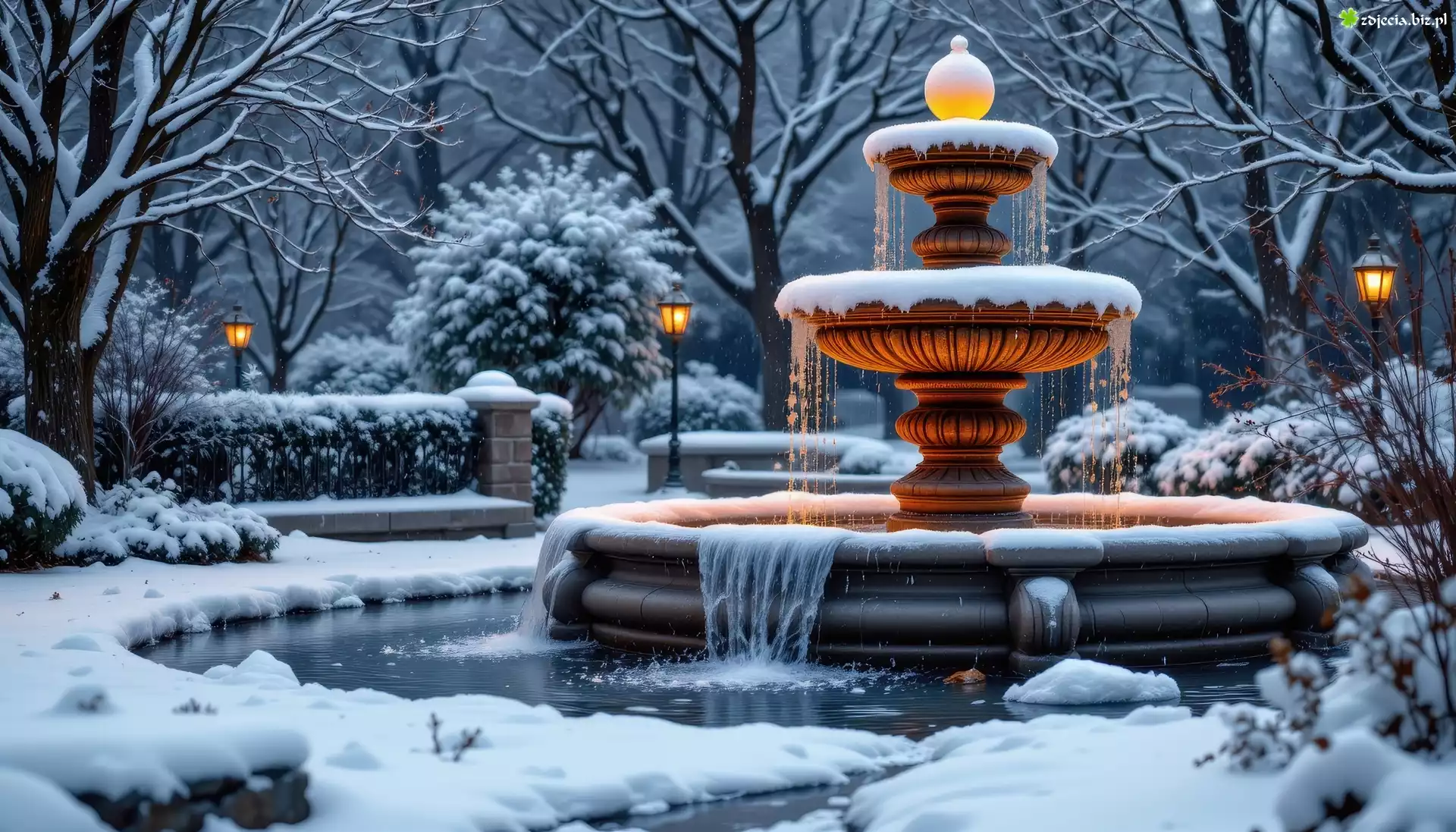 Zdjęcie Zima, Park, Fontanna, Latarnie