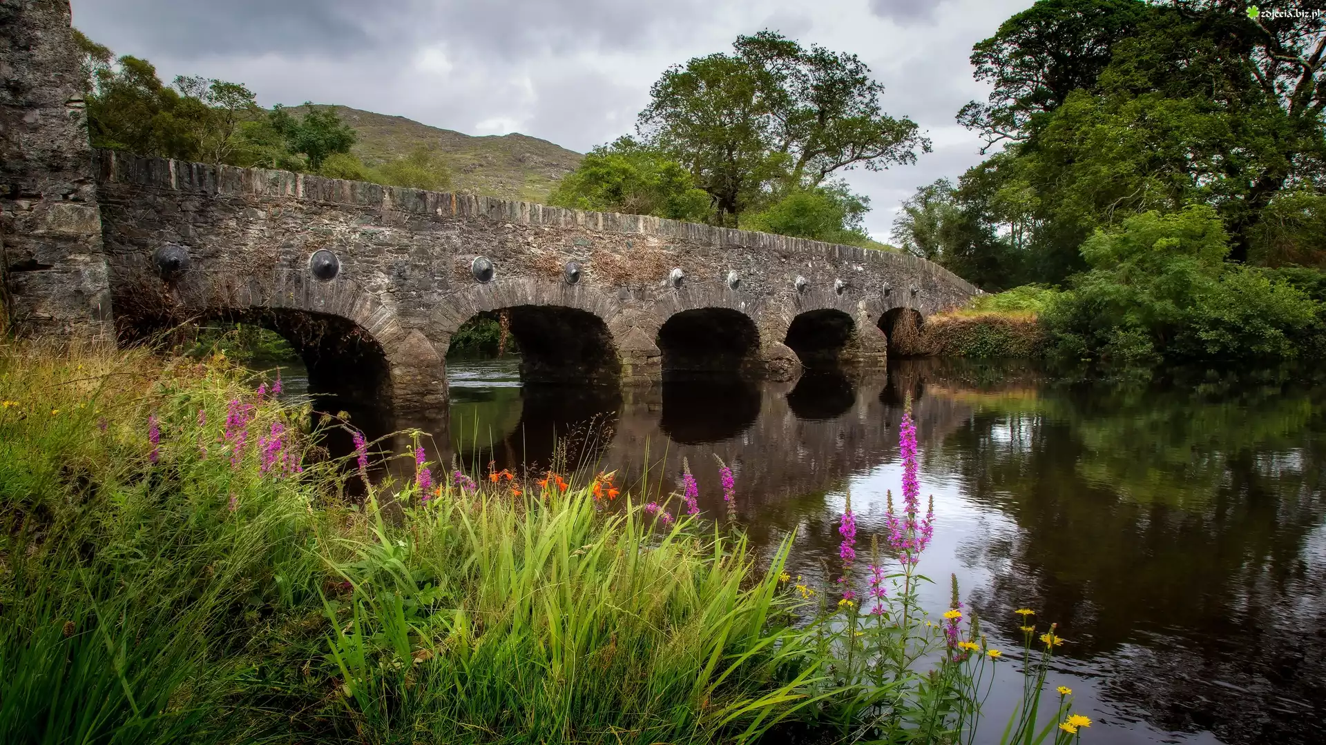 Zdjęcie, Rzeka, Most, Brzeg, Kwiaty, Rośliny, Drzewa, Chmury, Lato