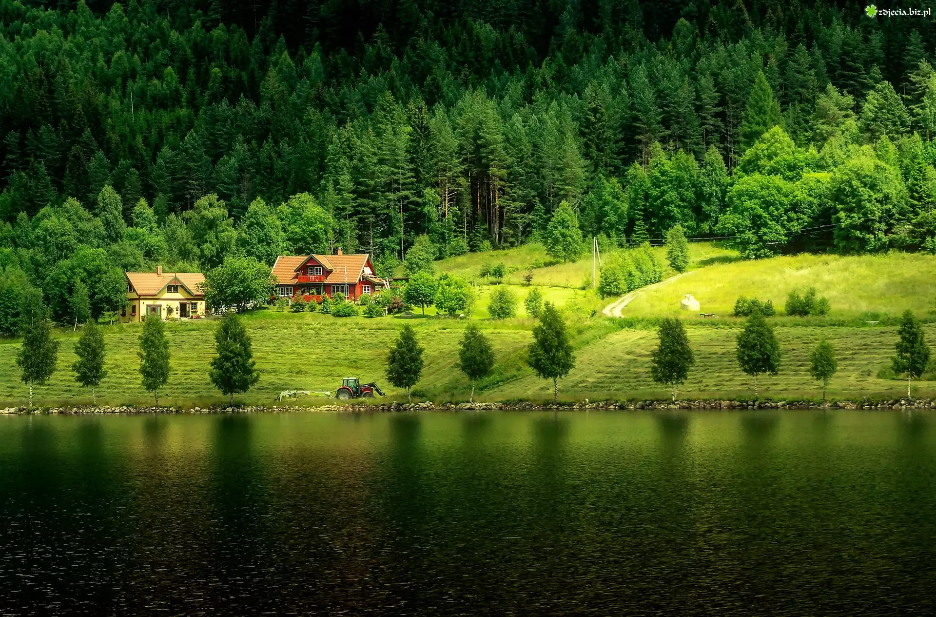 Zdjęcie, Lato, Rzeka, Domy, Pola, Las, Drzewa
