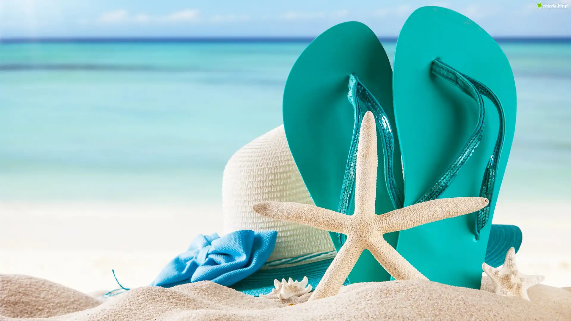 Zdjęcie Lato, Klapki, Rozgwiazdy, Kapelusz, Plaża, Wakacje
