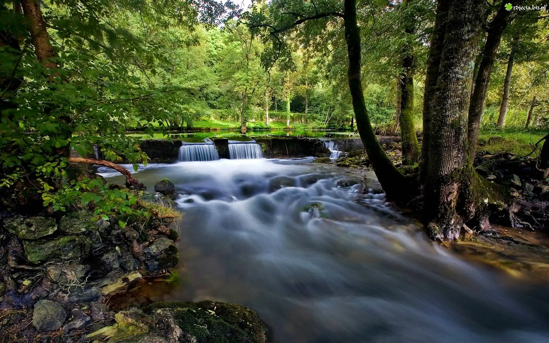 Zdjęcie Lato, Las, Rzeka, Kaskada, Przebijające, Światło