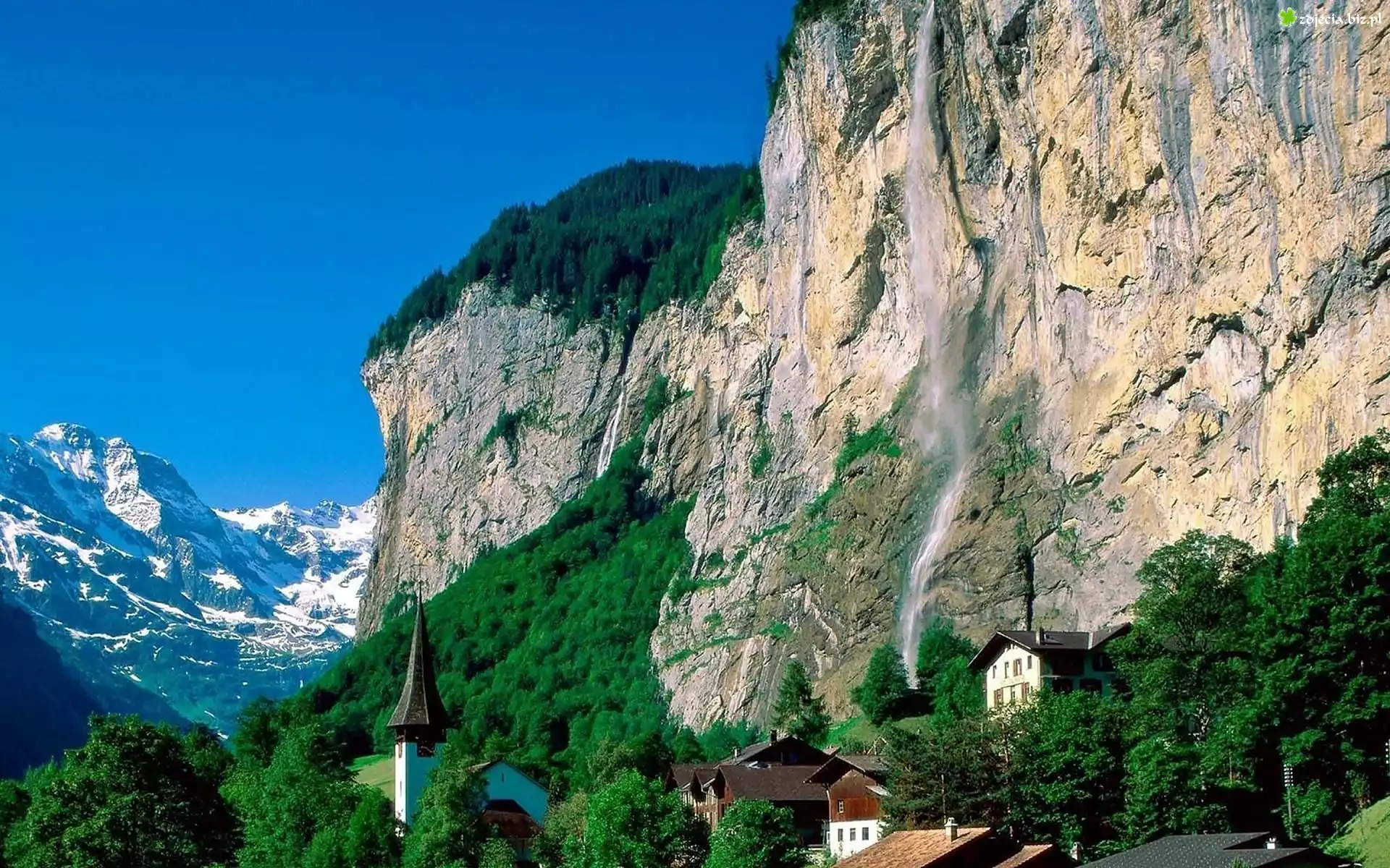 Zdjęcie Lauterbrunnen, Góry, Las, Wodospad, Kościół, Domy
