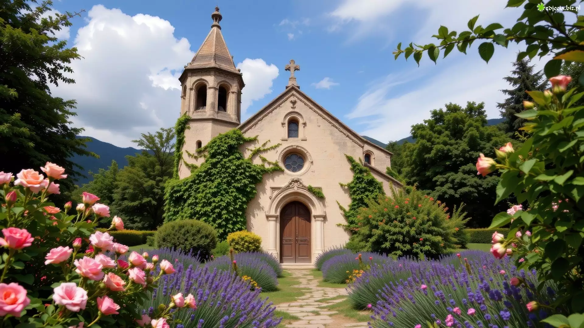 Zdjęcie Kościół, Kwiaty, Róże, Lawenda, Drzewa, Krzewy
