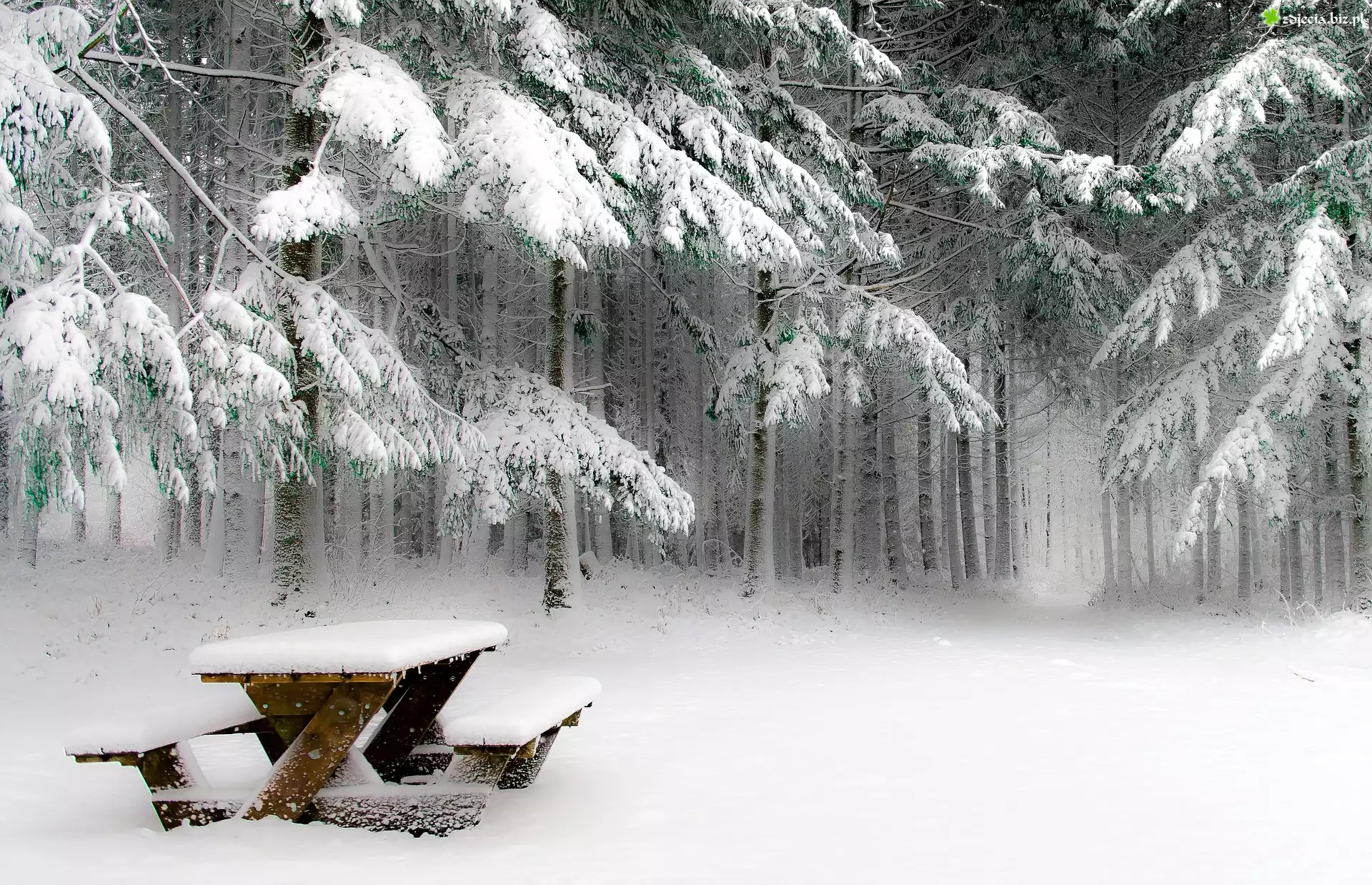 Zdjęcie Zima, Las, Śnieg, Ławka piknikowa, Drzewa