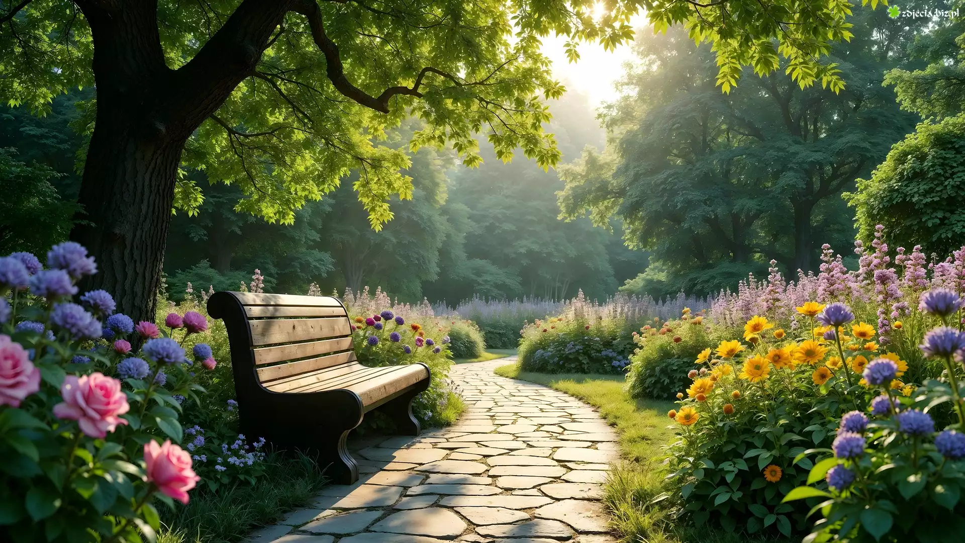 Zdjęcie Park, Drzewa, Kwiaty, Ławka, Ścieżka, Kamienista