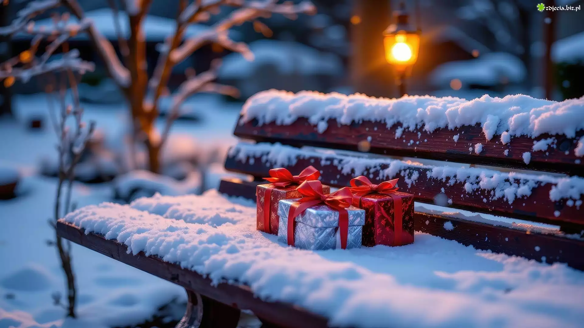 Zdjęcie Zima, Noc, Ośnieżona, Ławka, Prezenty, Latarnia