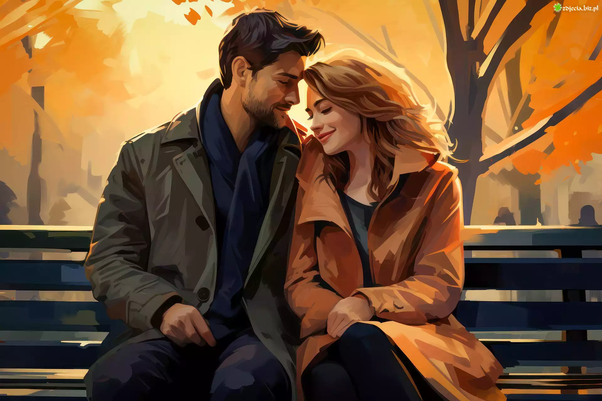 Zdjęcie Kobieta, Mężczyzna, Zakochani, Ławka, Park, Jesień, Grafika