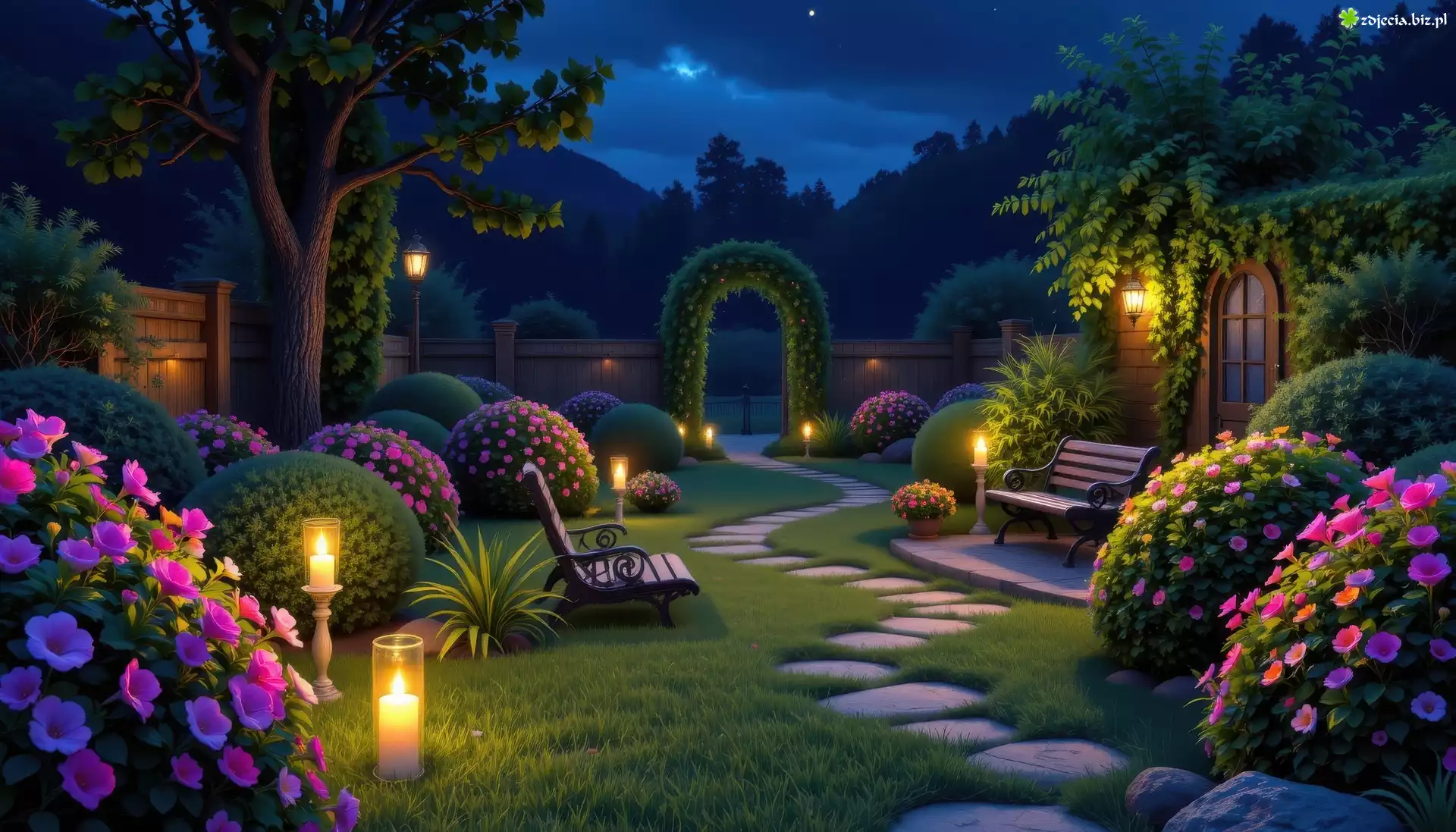 Zdjęcie Ogród, Noc, Krzewy, Ławki, Świece, Ścieżka
