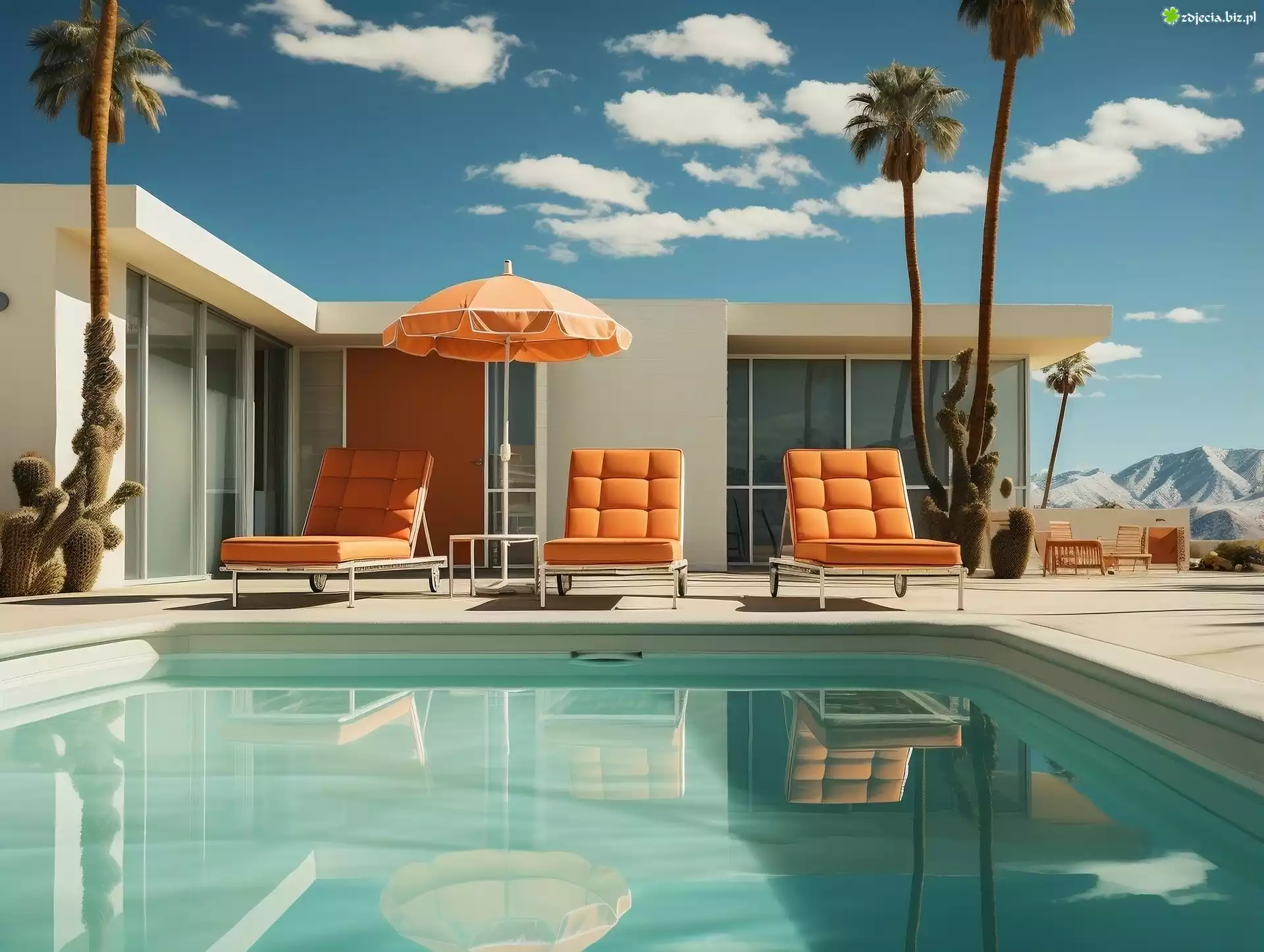 Zdjęcie, Basen, Leżaki, Palmy, Dom, 2D