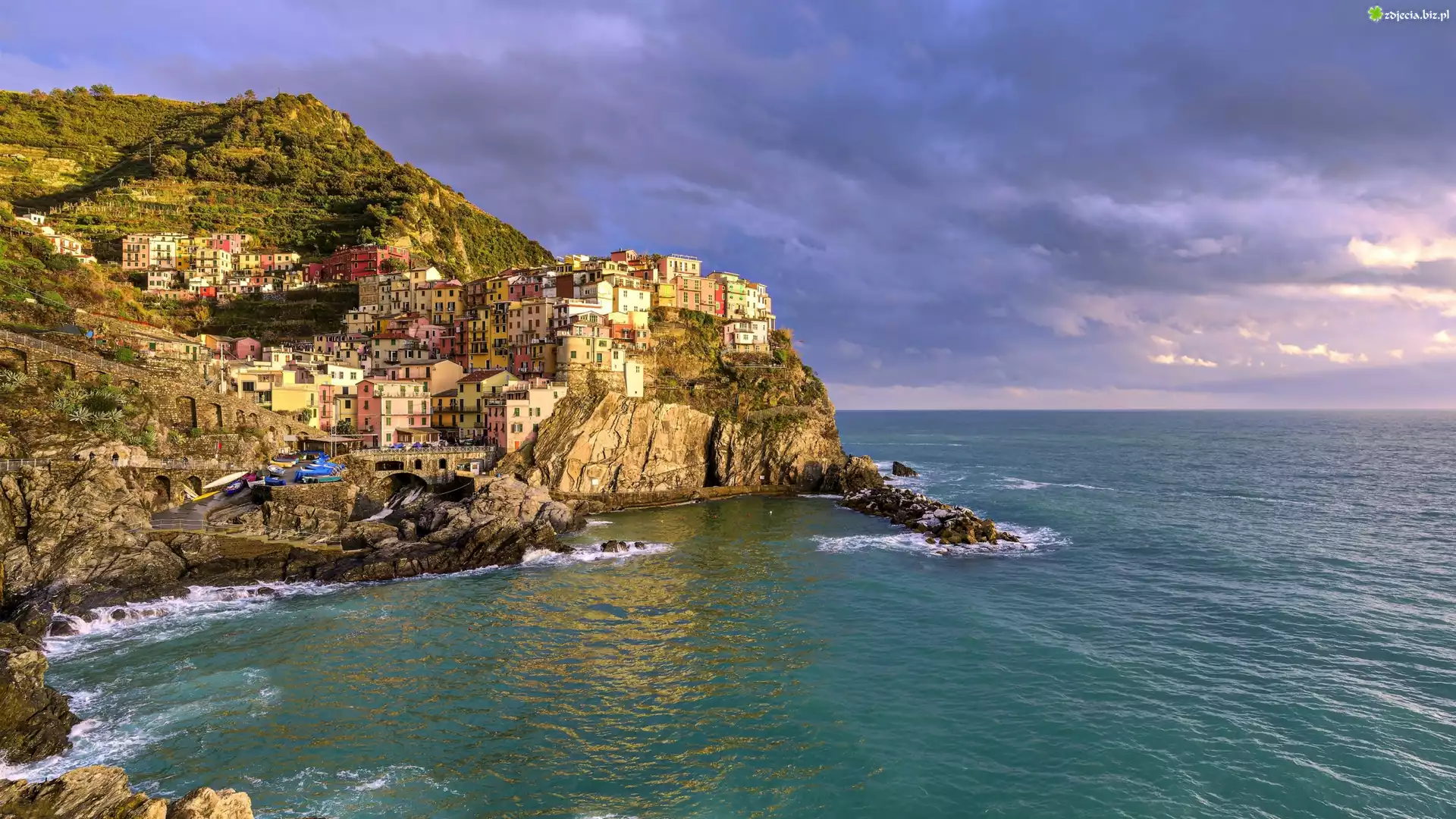 Zdjęcie Wybrzeże, Cinque Terre, Manarola, Morze Liguryjskie, Skały, Domy, Gmina Riomaggiore, Liguria, Włochy |