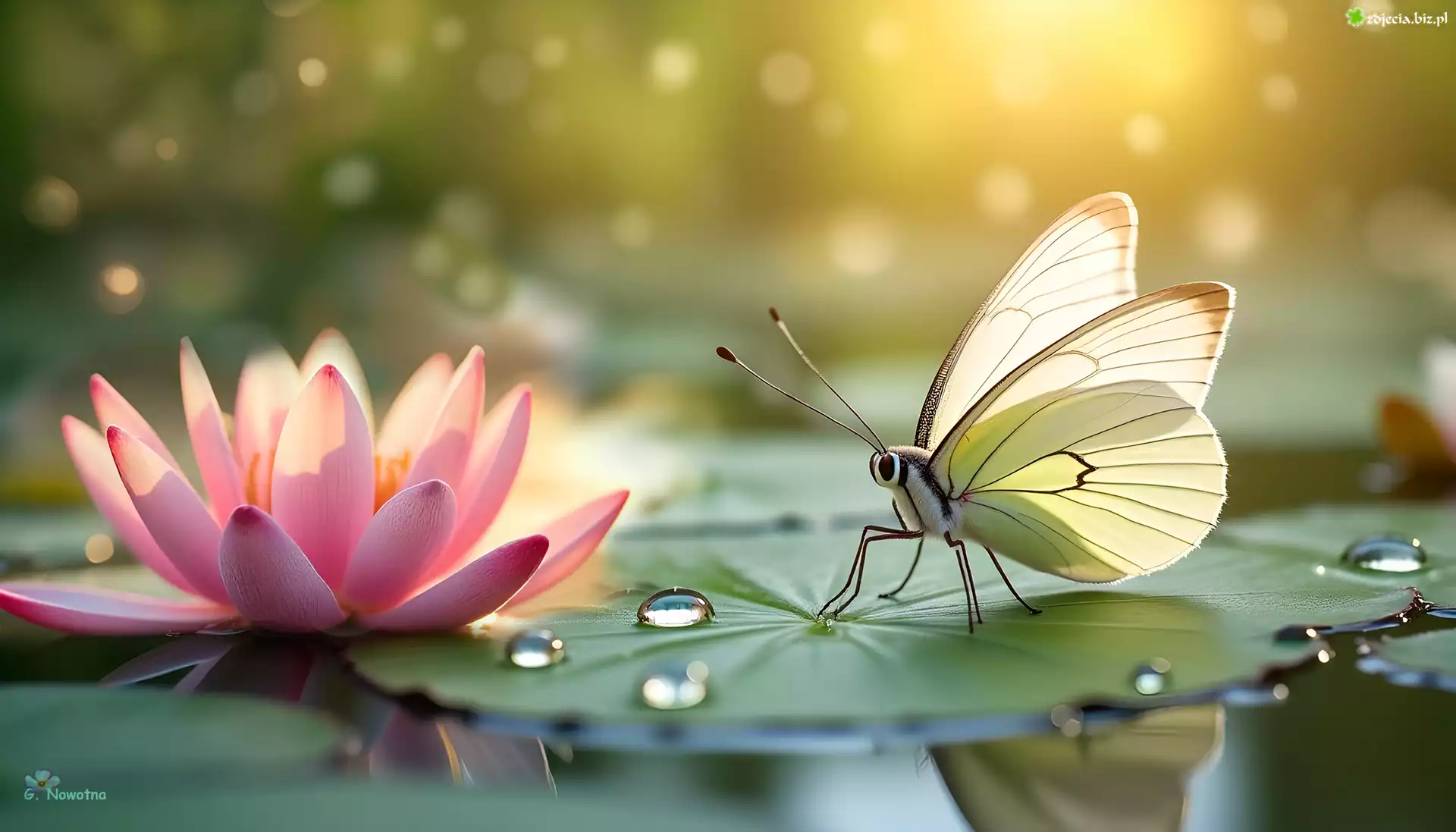 Zdjęcie Biały, Motyl, Różowa, Lilia wodna, Grafika