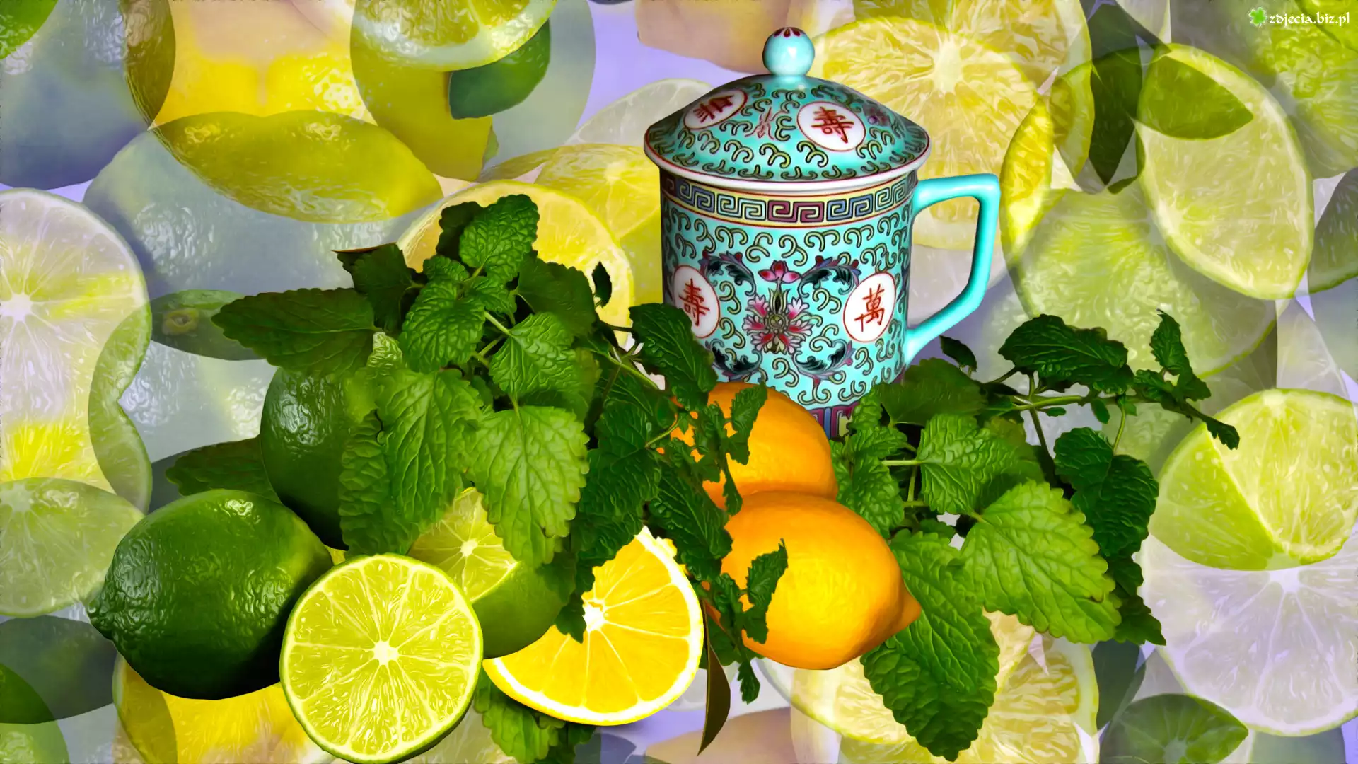 Zdjęcie, Cytryny, Limonki, Mięta, Kubek, Przykrywka, Zaparzacz, Grafika