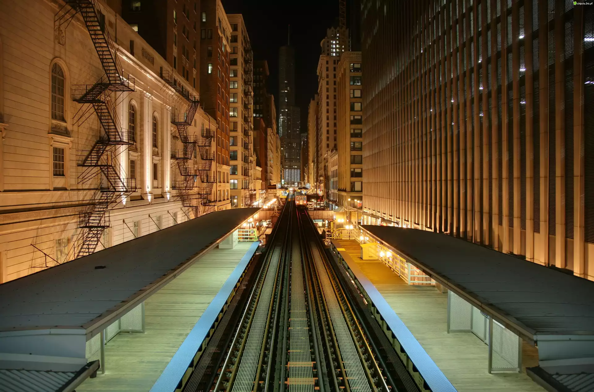 Zdjęcie, Linia Kolejowa, Przystanek, Miasto nocą