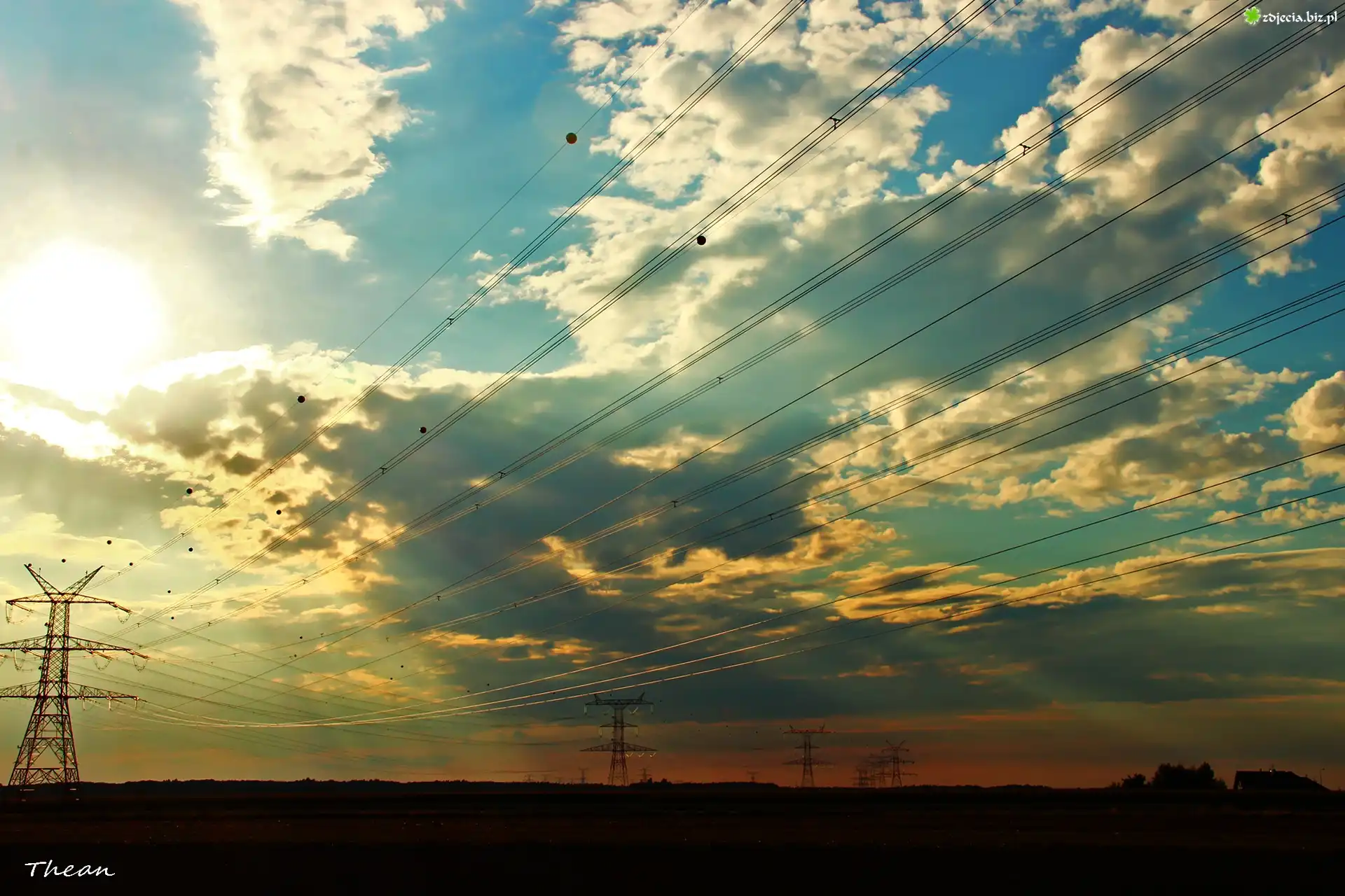 Zdjęcie Linie, Wysokiego, Napięcia, Niebo, Chmury, Promienie