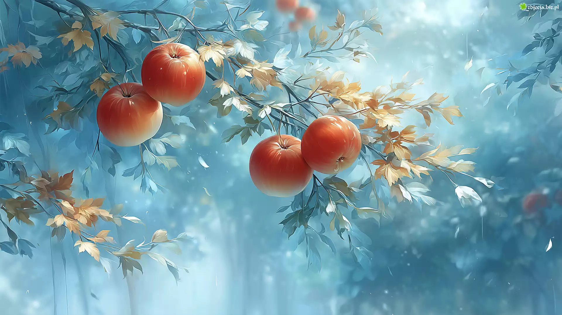 Zdjęcie Cztery, Jabłka, Jesienne, Liście, Grafika AI