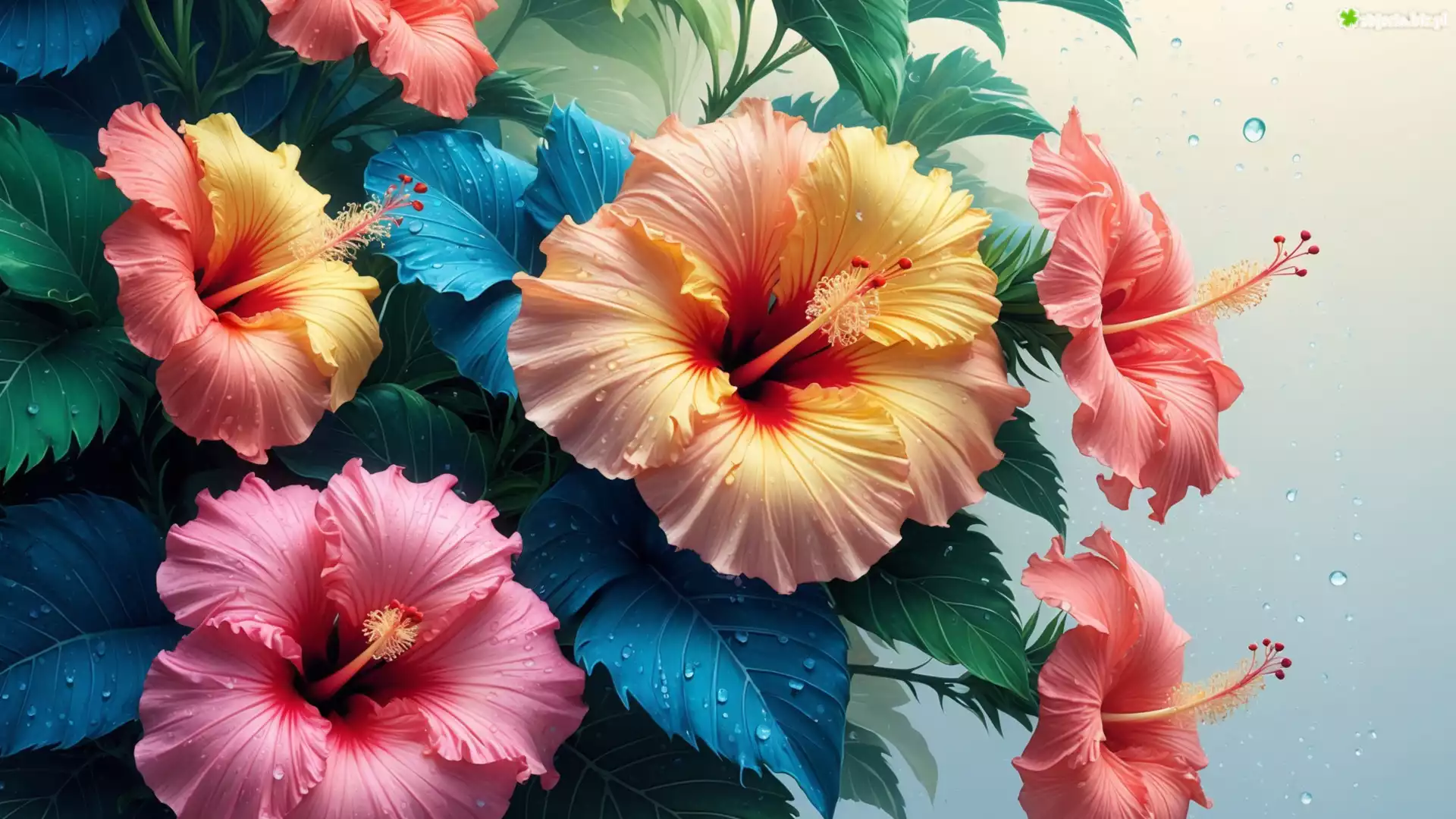 Zdjęcie Hibiskusy, Kolorowe, Kwiaty, Liście, Krople, Grafika
