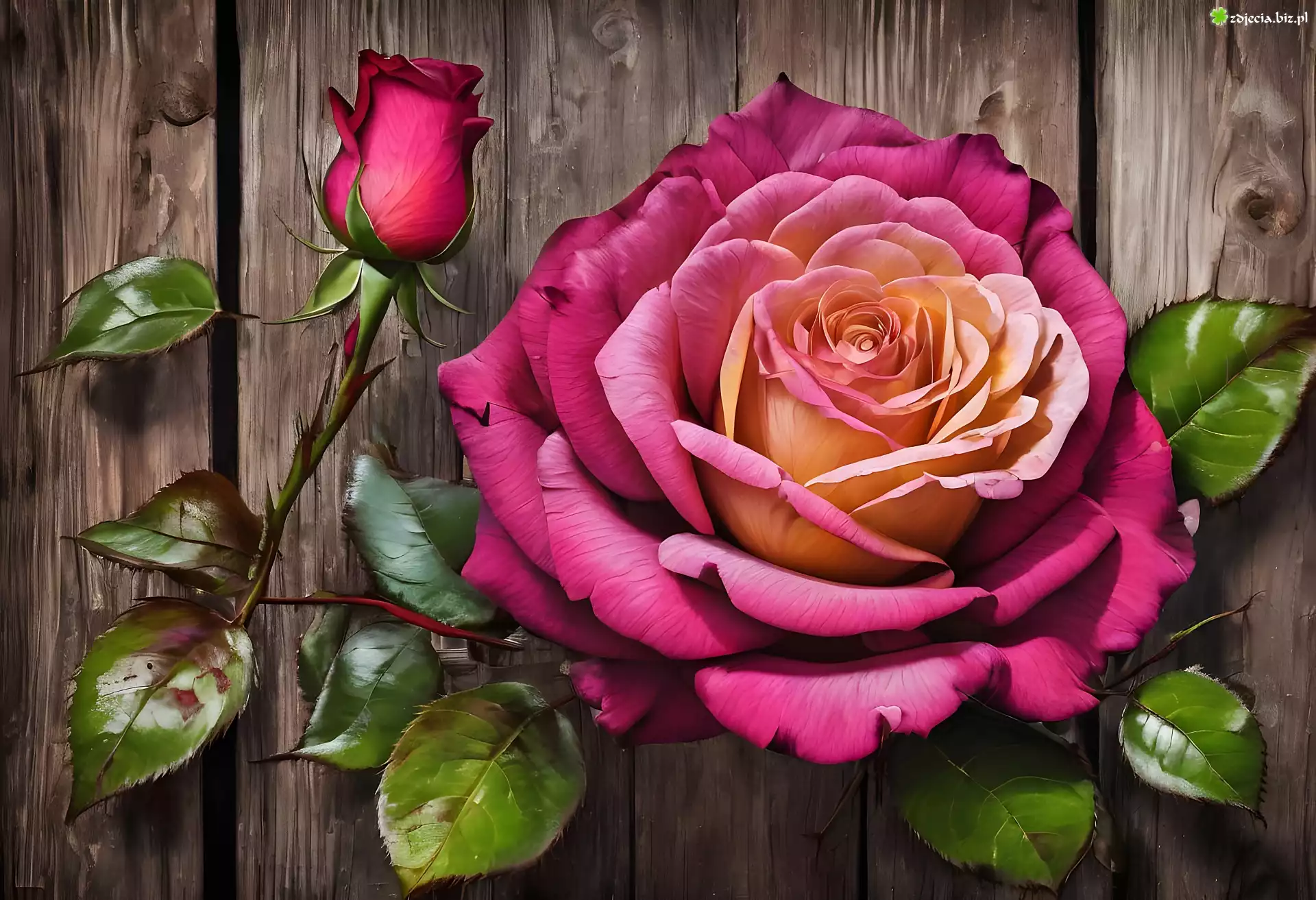 Zdjęcie Róża, Kwiat, Pąk, Liście, Deski, Grafika