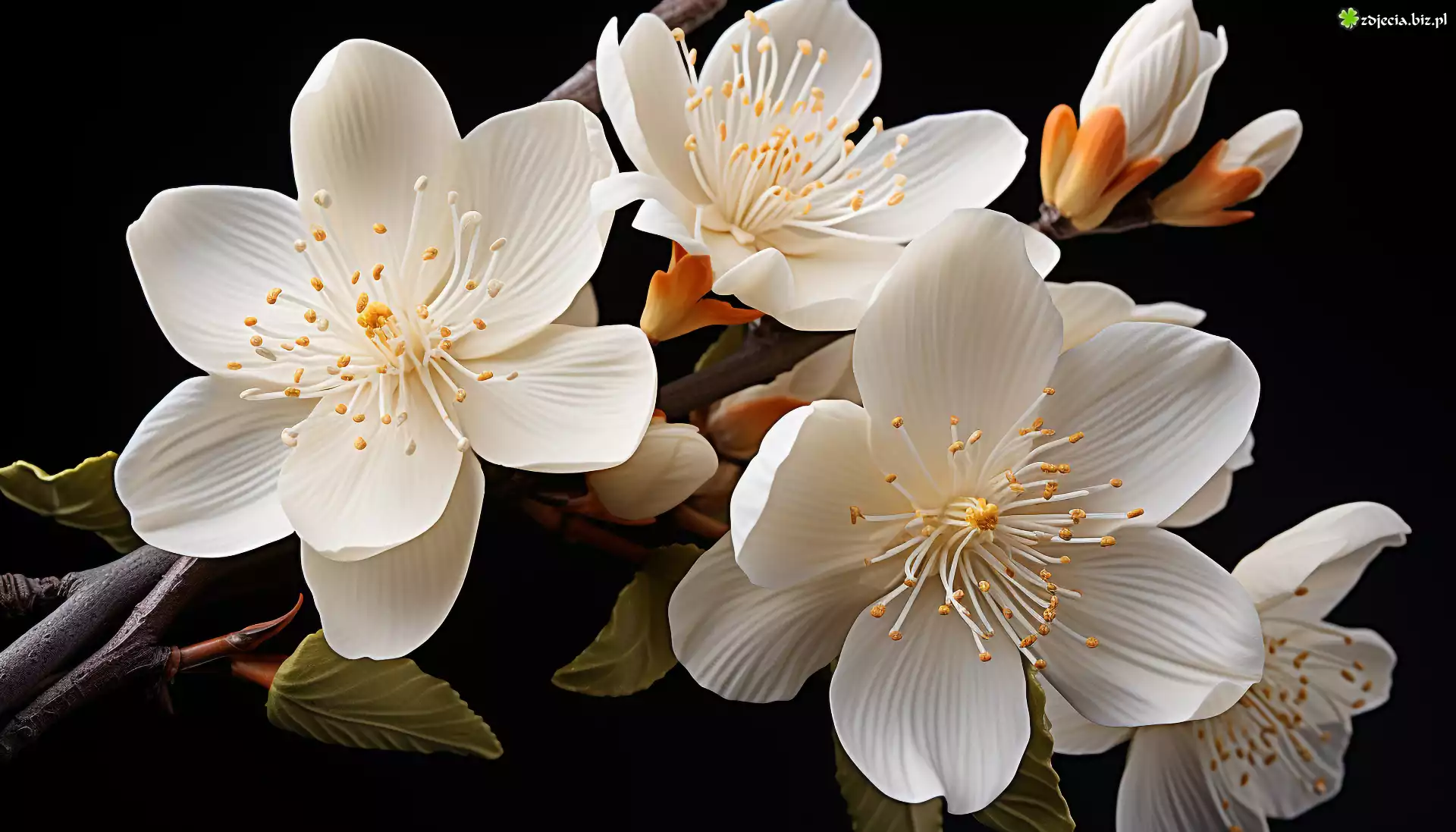 Zdjęcie Kwiaty, Białe, Pąki, Liście, Gałązka, Grafika
