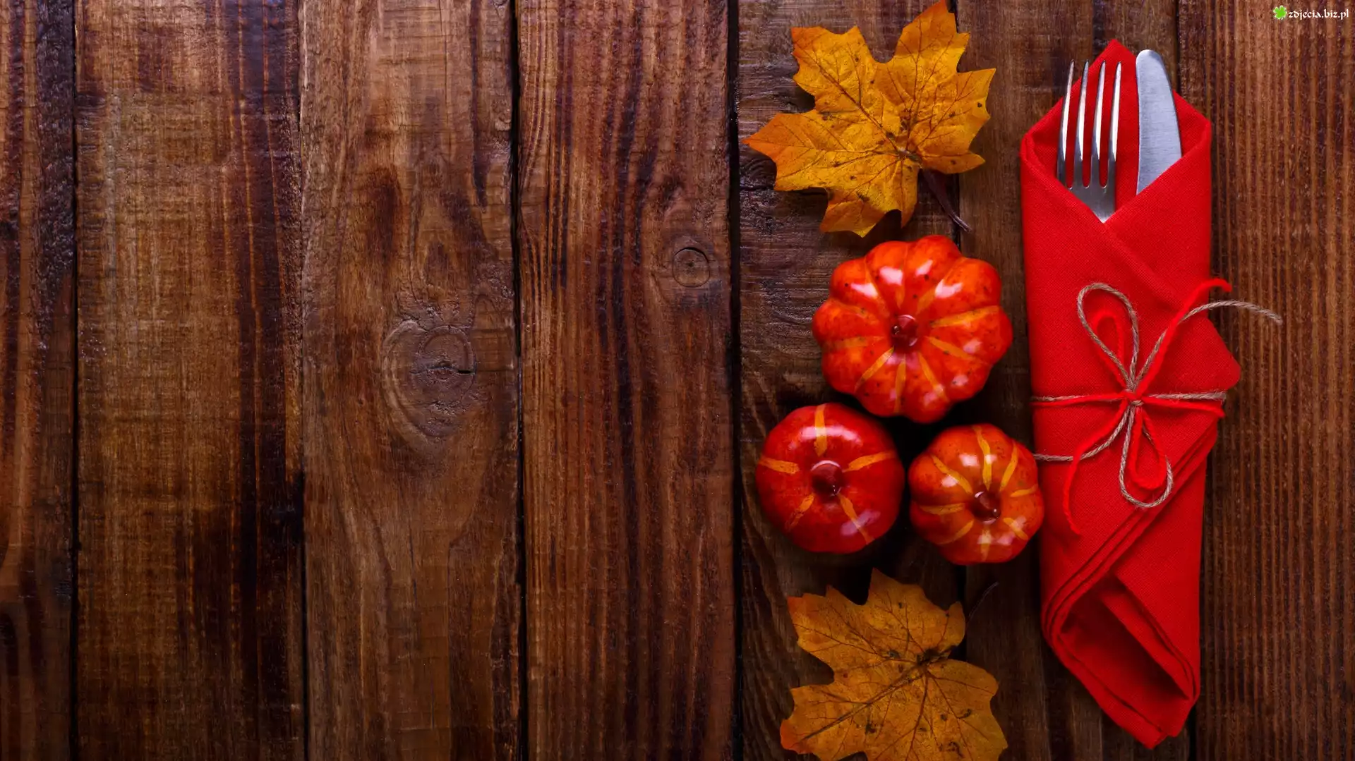 Zdjęcie Jesienne, Liście, Małe, Dynie, Sztućce, Serwetka, Deski