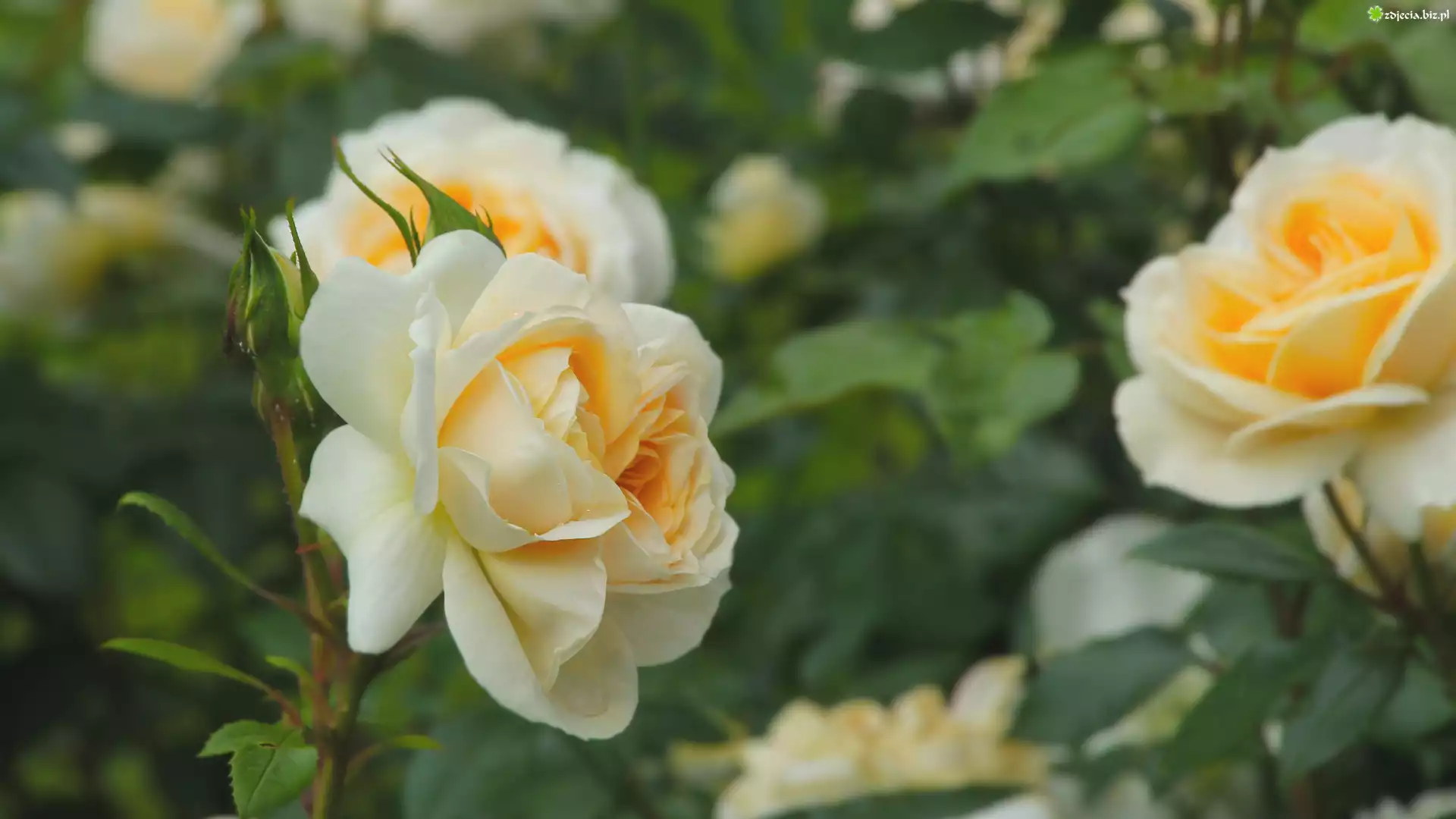 Zdjęcie Kremowe, Kwitnące, Róże, Liście