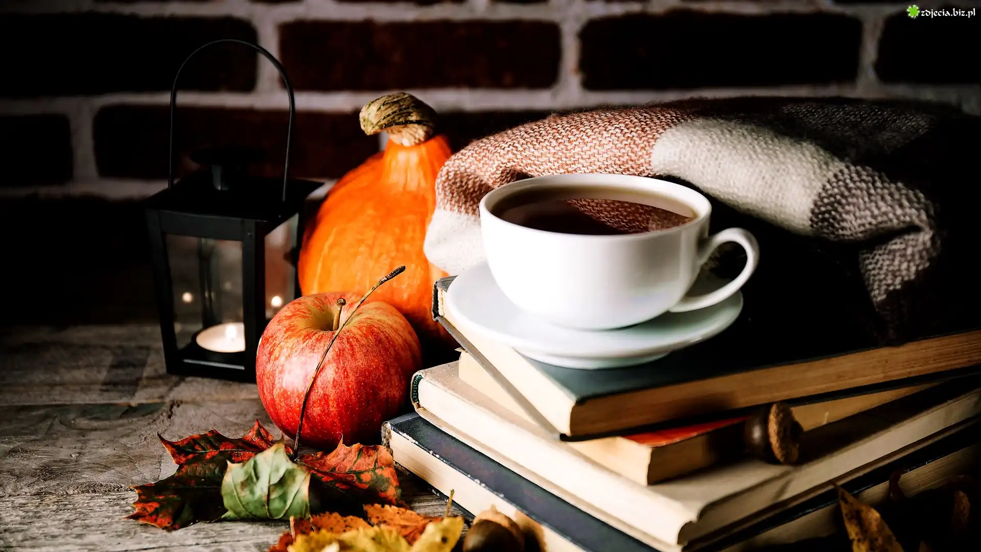 Zdjęcie Liście, Dynia, Jabłko, Herbata, Książki, Koc