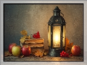 Zdjęcie, Kompozycja, Lampion, Książki, Jabłka, Czerwone, Jagody, Pożółkłe, Liście