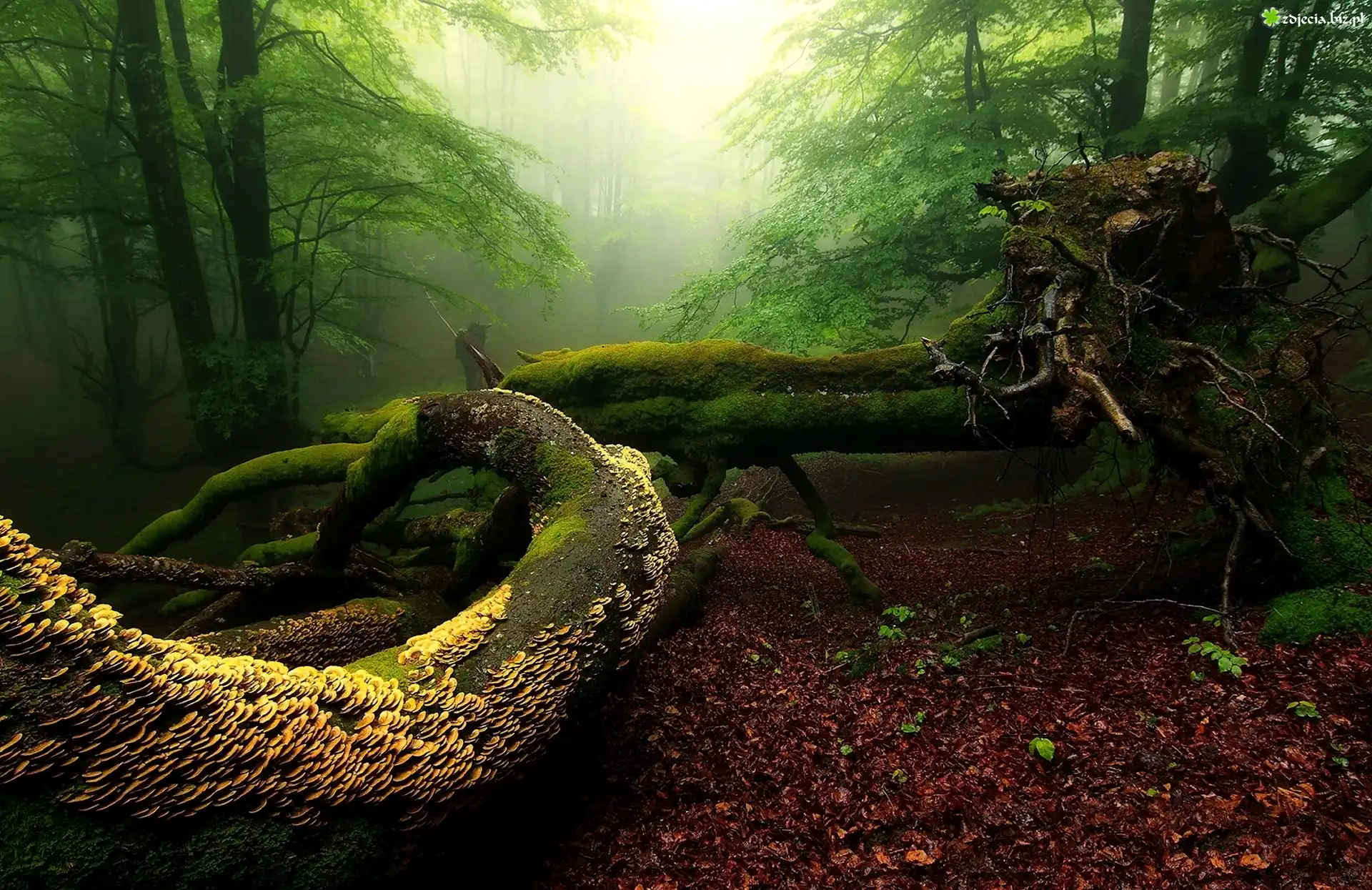 Zdjęcie Hiszpania, Kraj Basków, Las, Mgła, Omszałe, Powalone, Drzewo, Grzyby, Liście