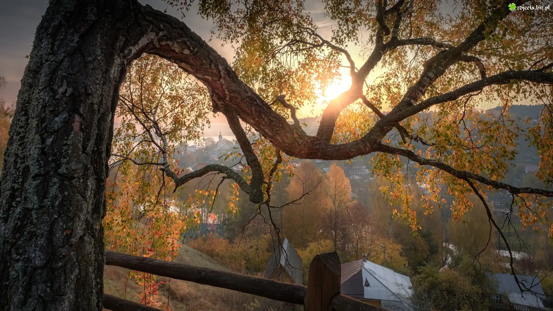 Zdjęcie Brzoza, Pożółkłe, Liście, Płot, Ogrodzenie, Domy, Miasto Plos, Obwód iwanowski, Rosja