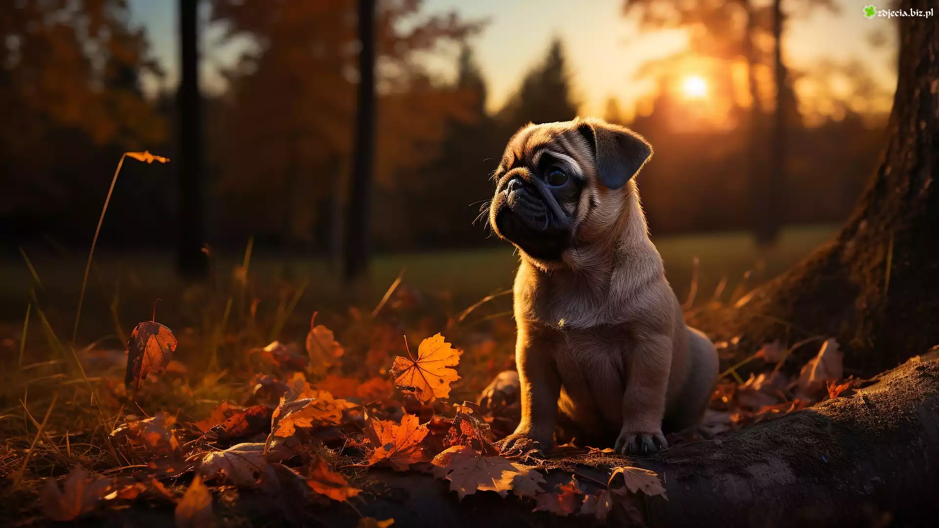 Zdjęcie Pies, Mops, Drzewo, Liście
