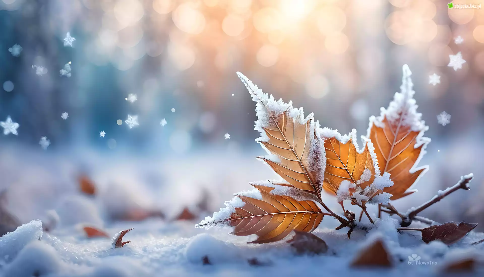 Zdjęcie Oszronione, Liście, Śnieg, Zima, Grafika