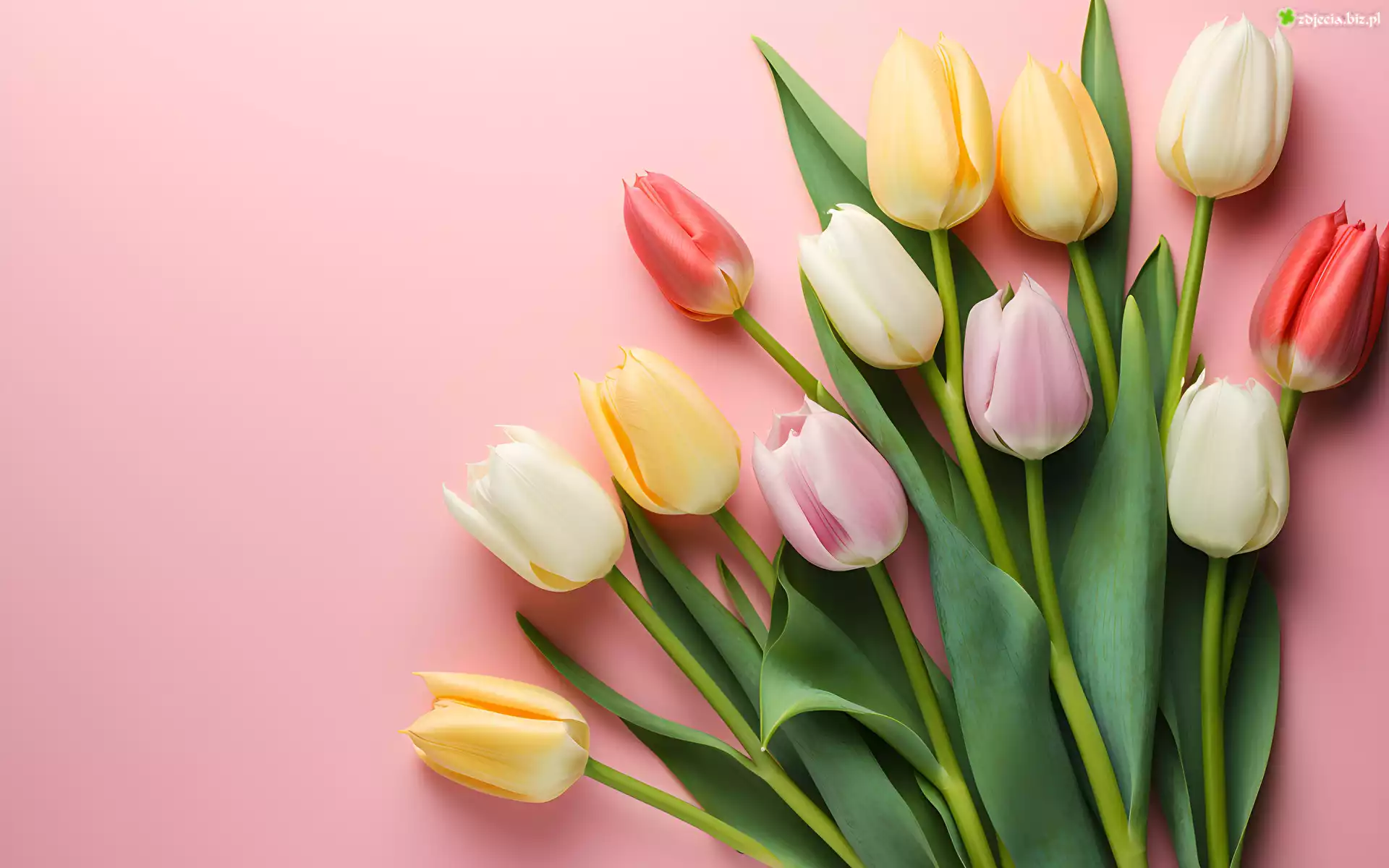 Zdjęcie Kwiaty, Kolorowe, Tulipany, Liście, Różowe tło