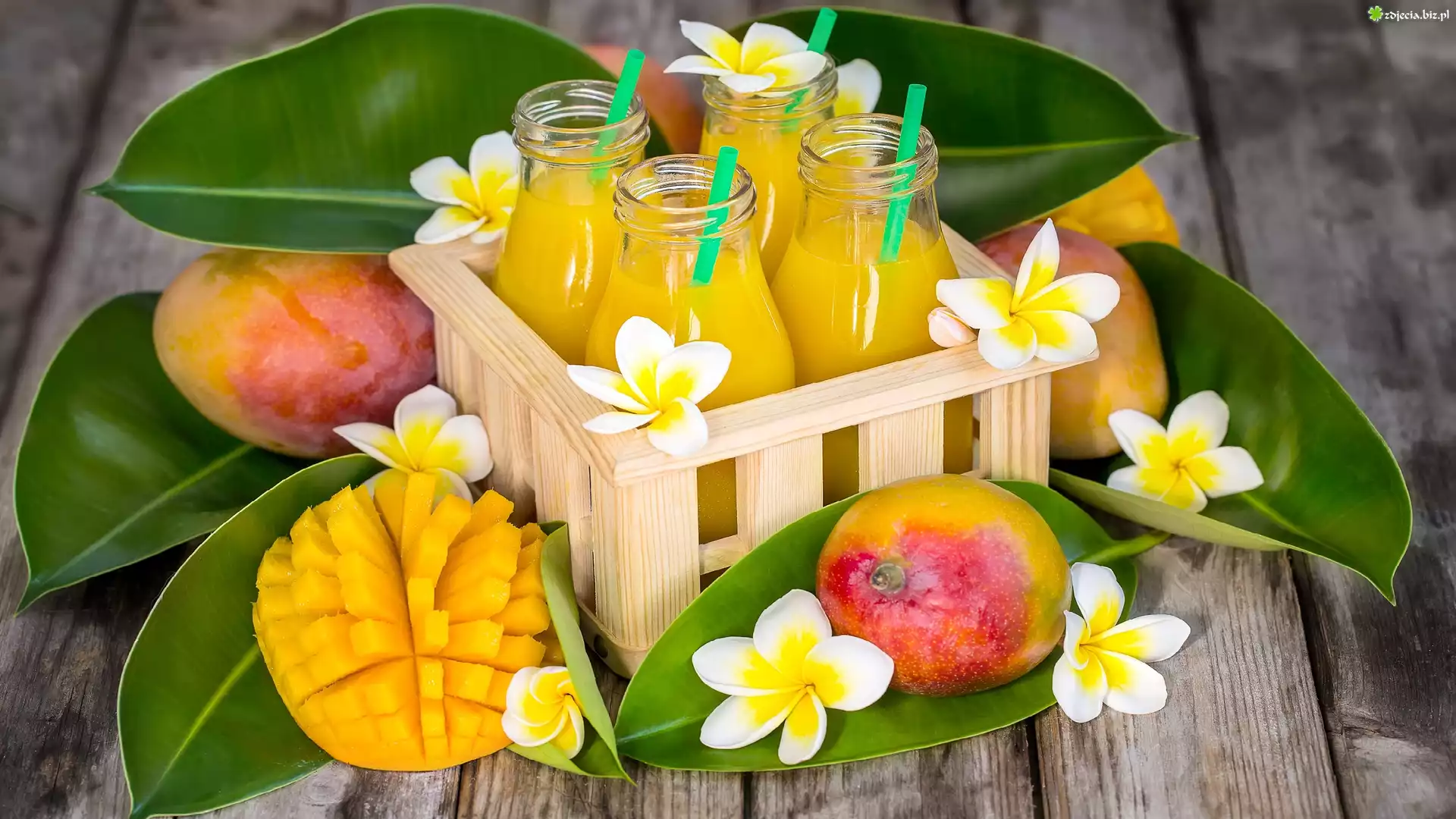 Zdjęcie Mango, Listki, Kwiatki, Plumerie, Skrzynka, Soki, Butelki