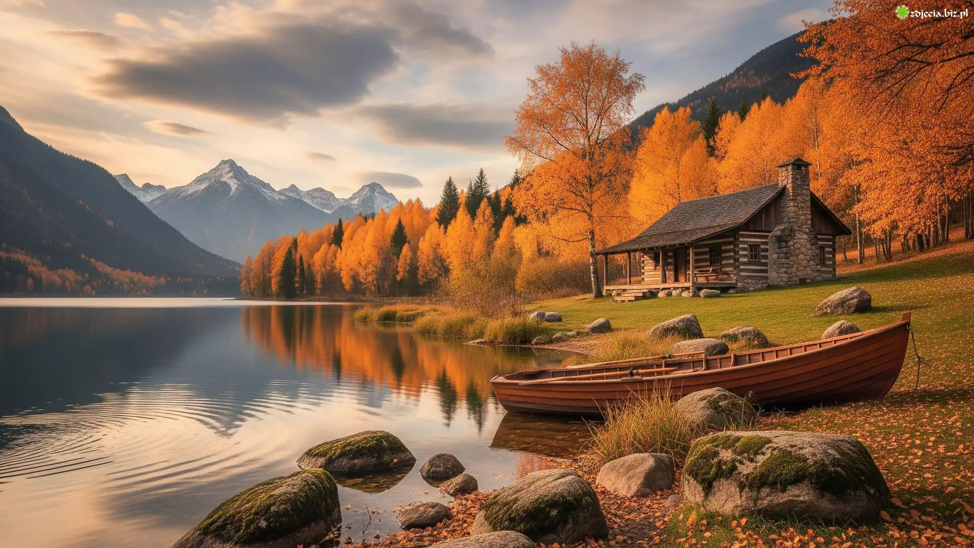 Zdjęcie Jesień, Jezioro, Kamienie, Łódka, Dom, Drzewa, Góry