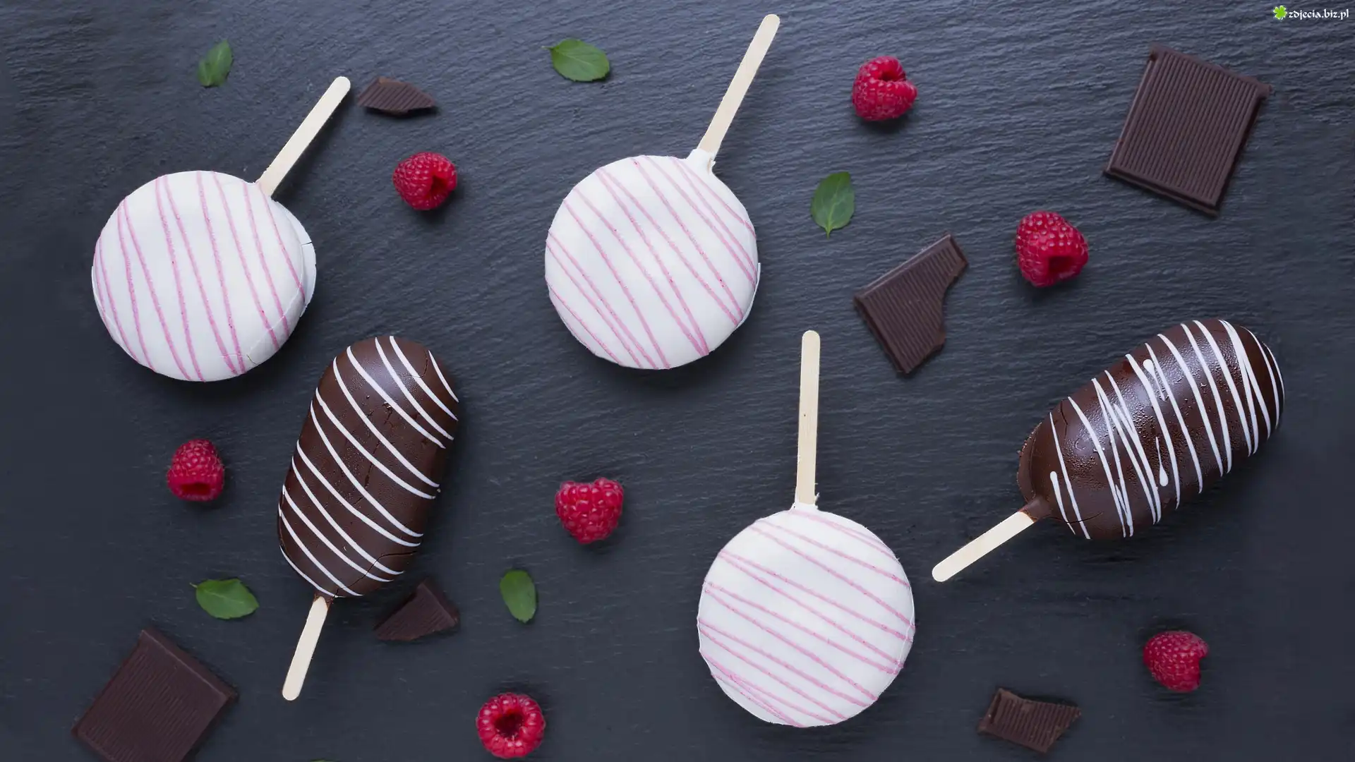 Zdjęcie, Lody, Polewa, Maliny, Czekolada, Kawałki