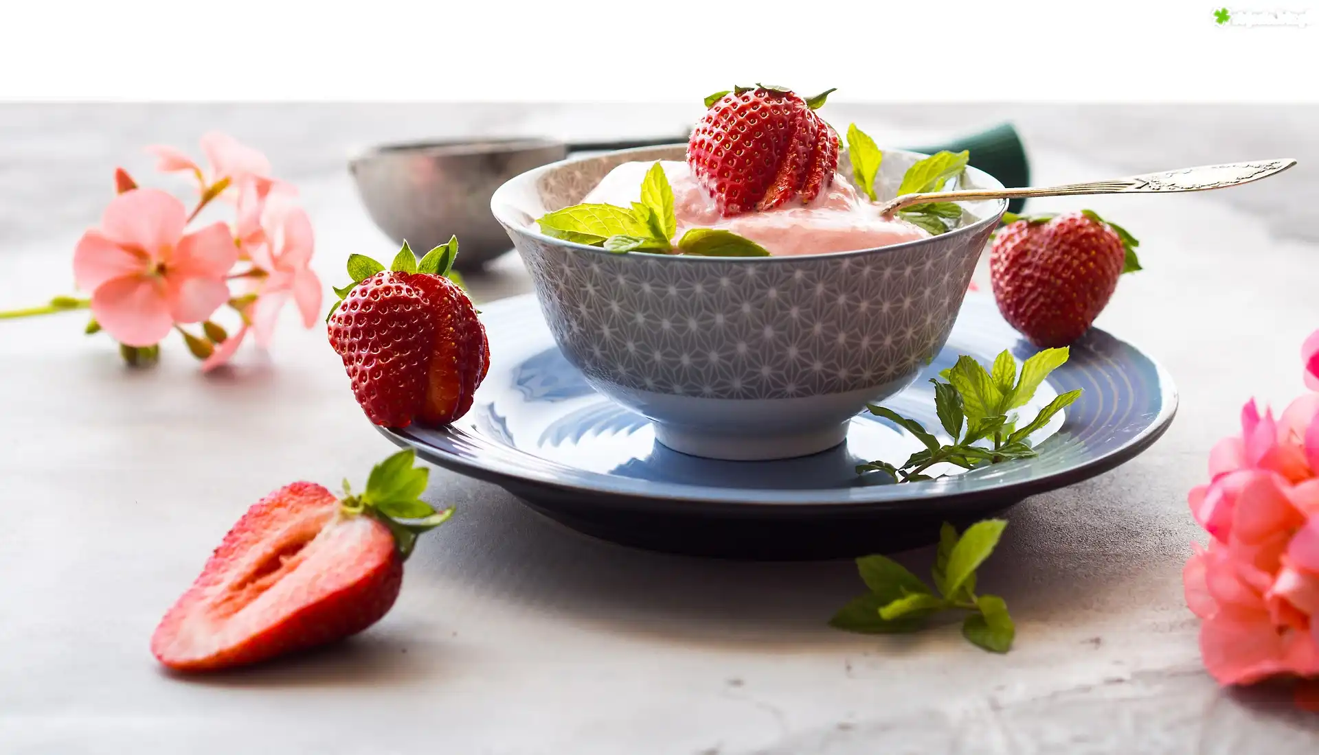 Zdjęcie Pucharek, Lody, Łyżeczka, Listki, Mięty, Truskawki, Kwiaty, Pelargonia