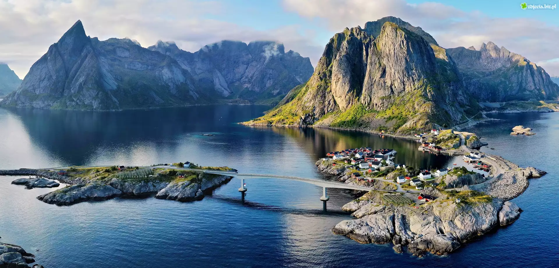 Zdjęcie Norwegia, Morze, Góry, Lofoty, Wioski, Domy