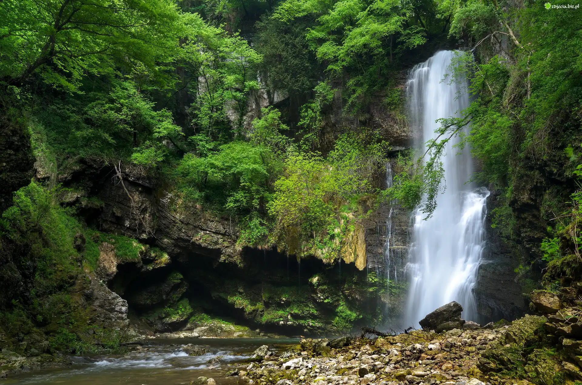 Zdjęcie, Włochy, Lombardia, Valganna, Wodospad Ferrera, Skały, Kamienie, Drzewa