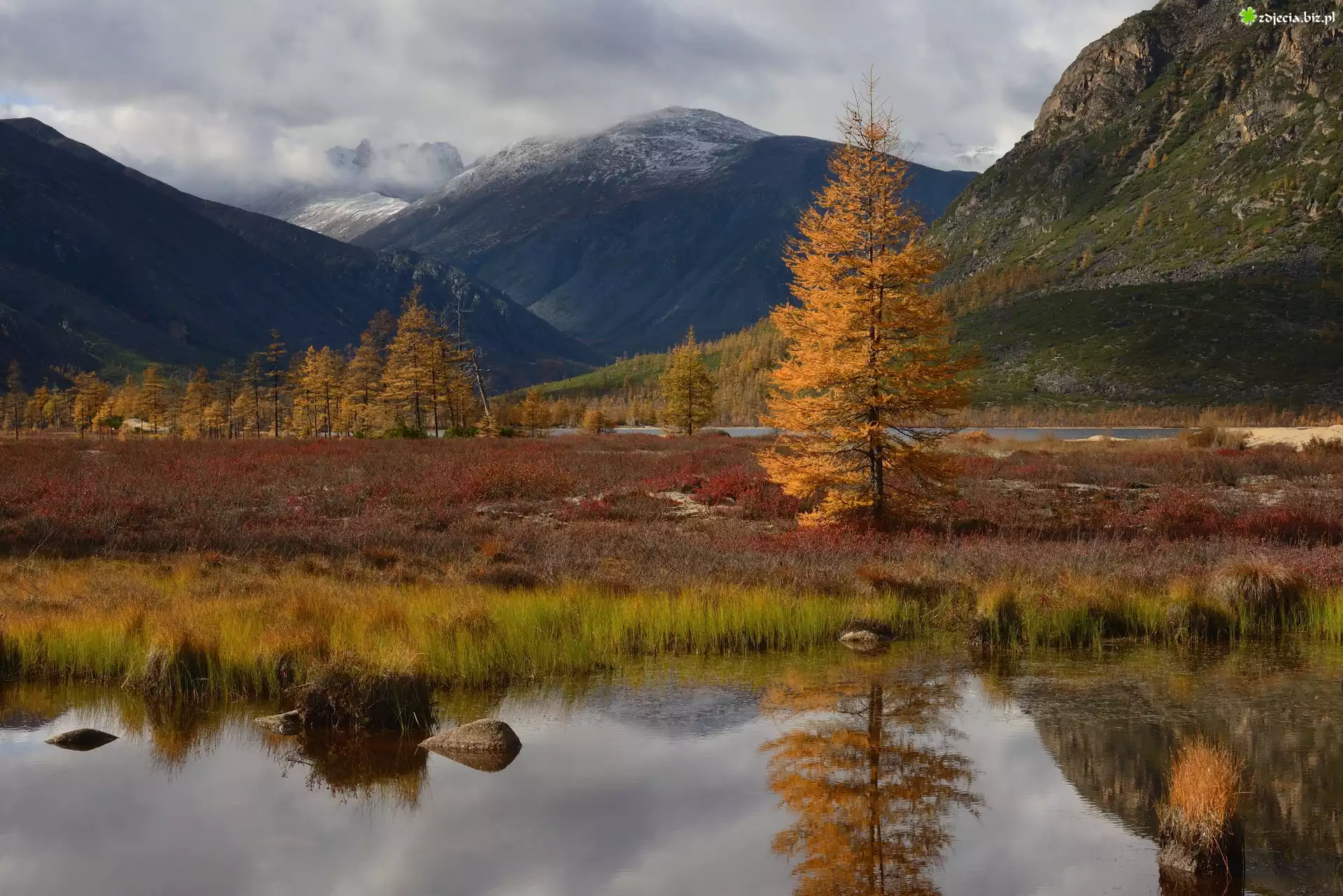 Zdjęcie Góry Kołymskie, Jezioro Jack London, Drzewa, Trawa, Mgła, Odbicie, Jesień, Kołyma, Obwód magadański, Rosja |