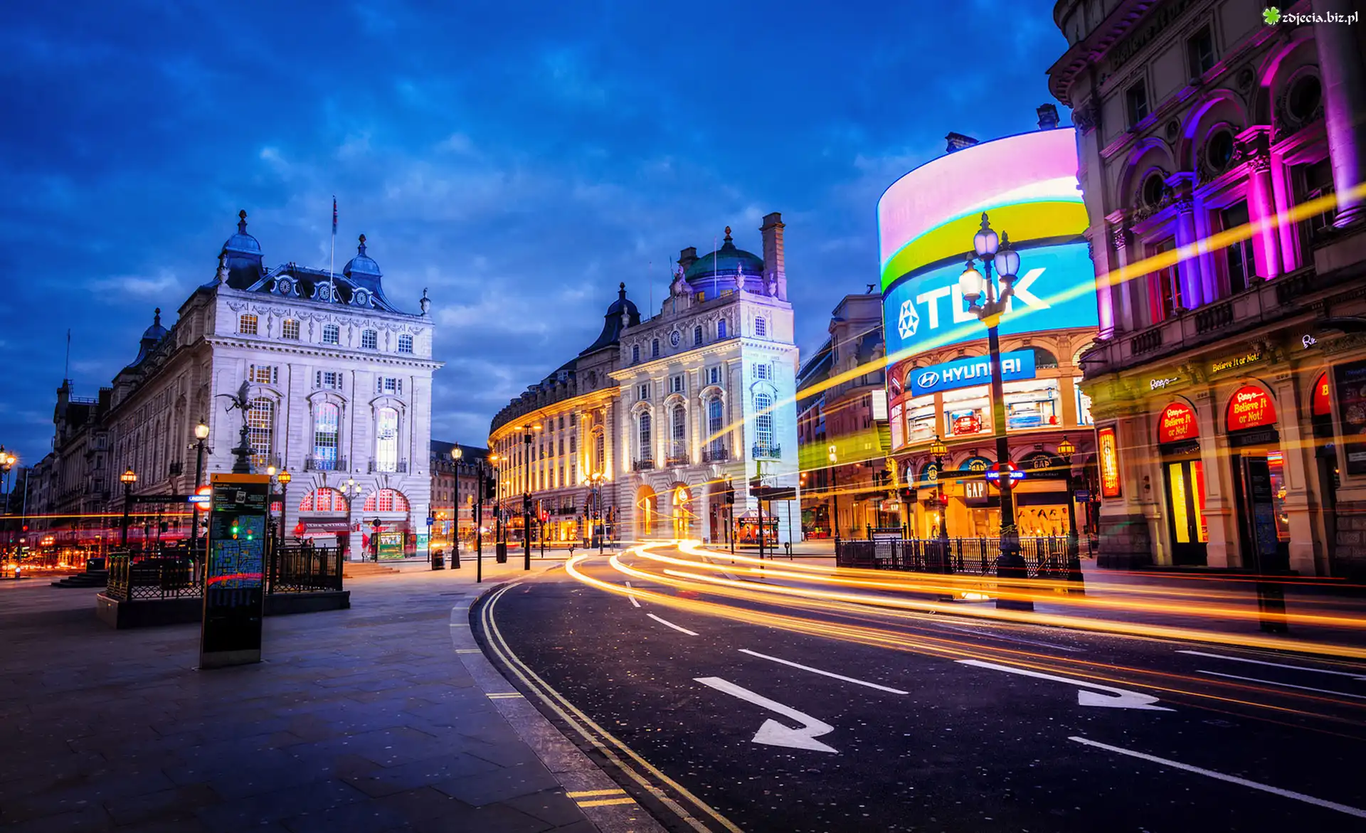 Zdjęcie, Anglia, Londyn, Plac Piccadilly Circus, Ulica, Światła, Domy