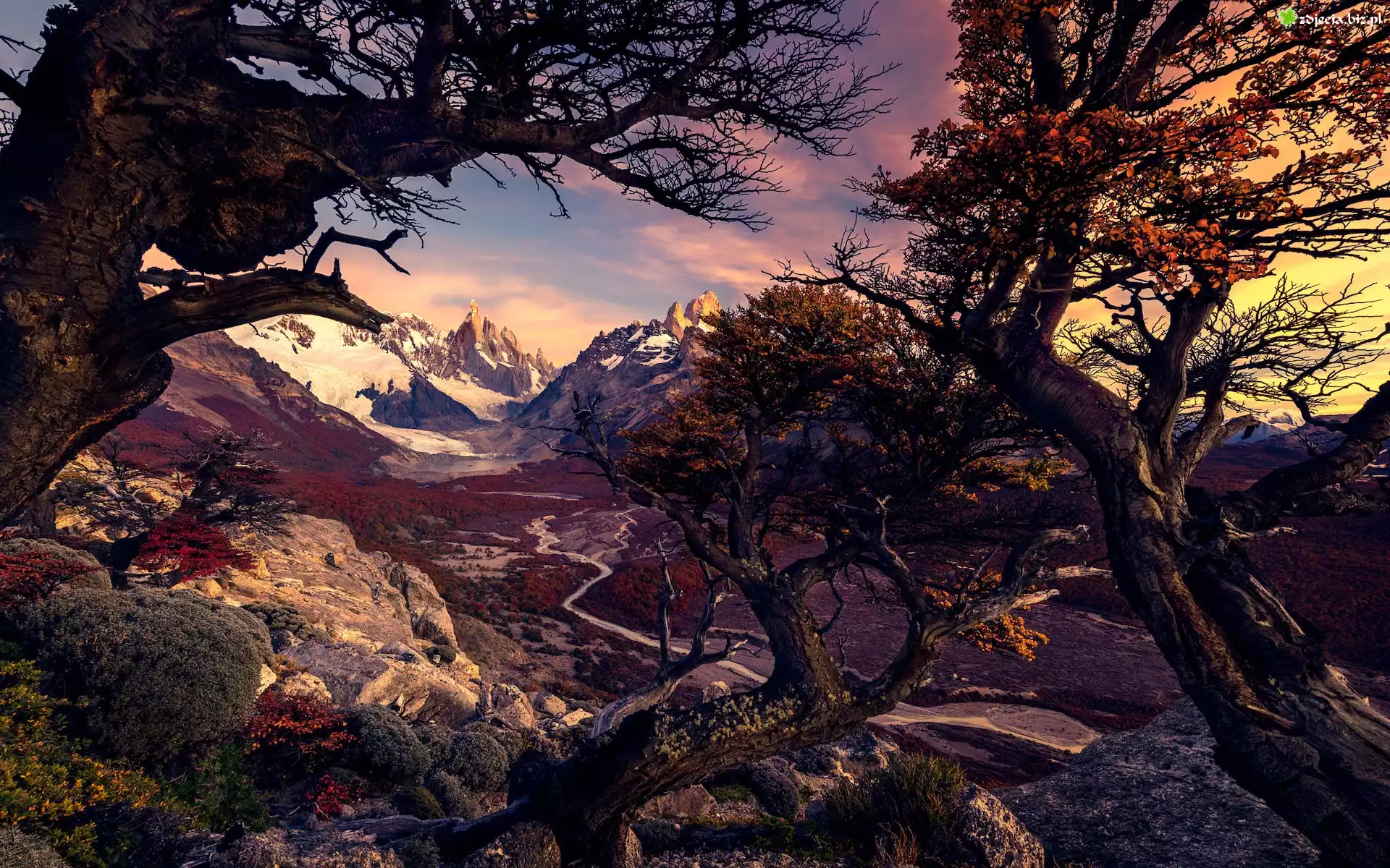 Zdjęcie, Argentyna, Patagonia, Góry, Andy, Park Narodowy Los Glaciares, Drzewa, Droga, Jesień