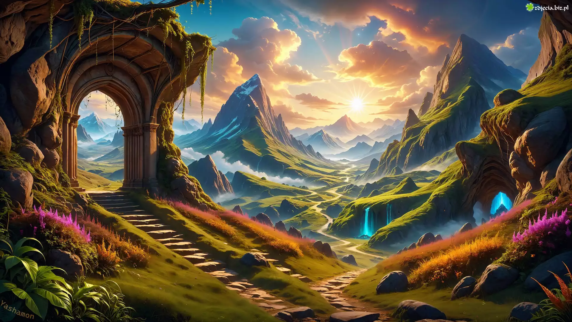 Zdjęcie Grafika, Góry, Budowla, Łuk, Schody, Roślinność, Fantasy