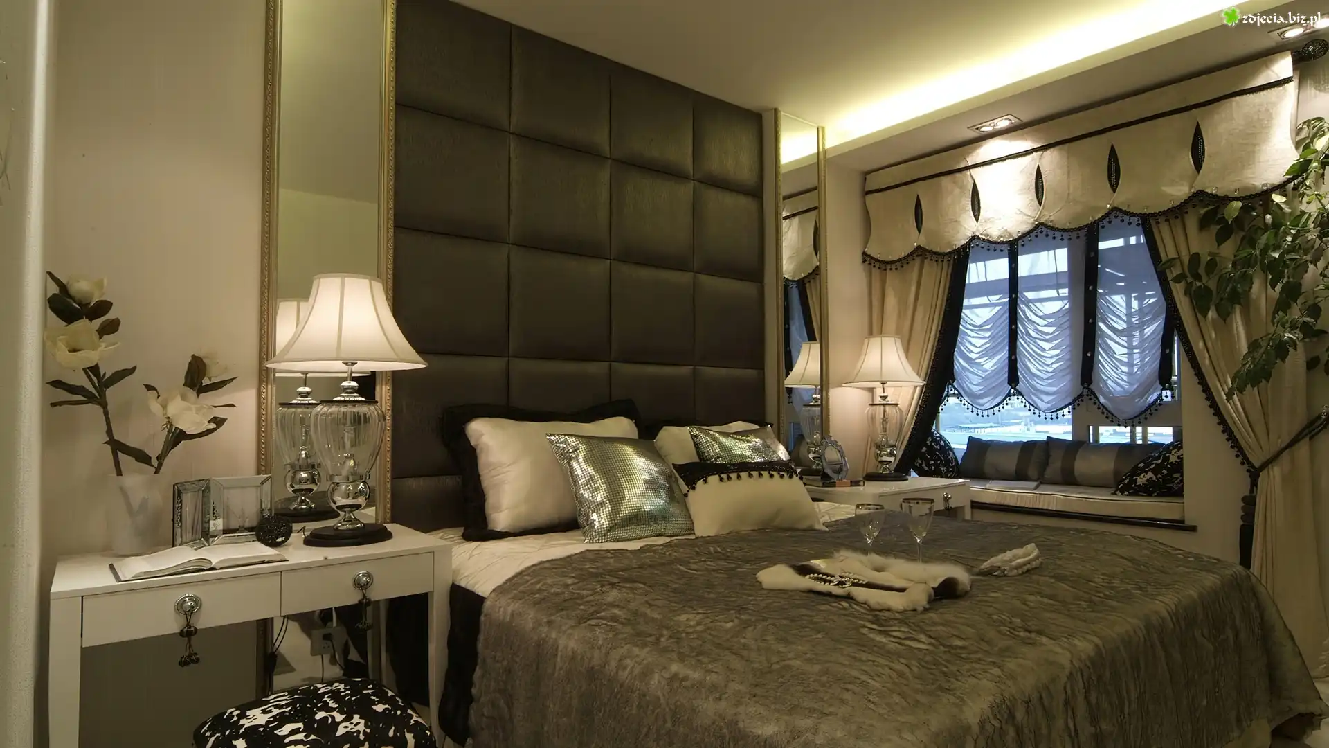 Zdjęcie Luksusowa, Sypialnia, Zasłony, Dekoracyjne, Poduszki