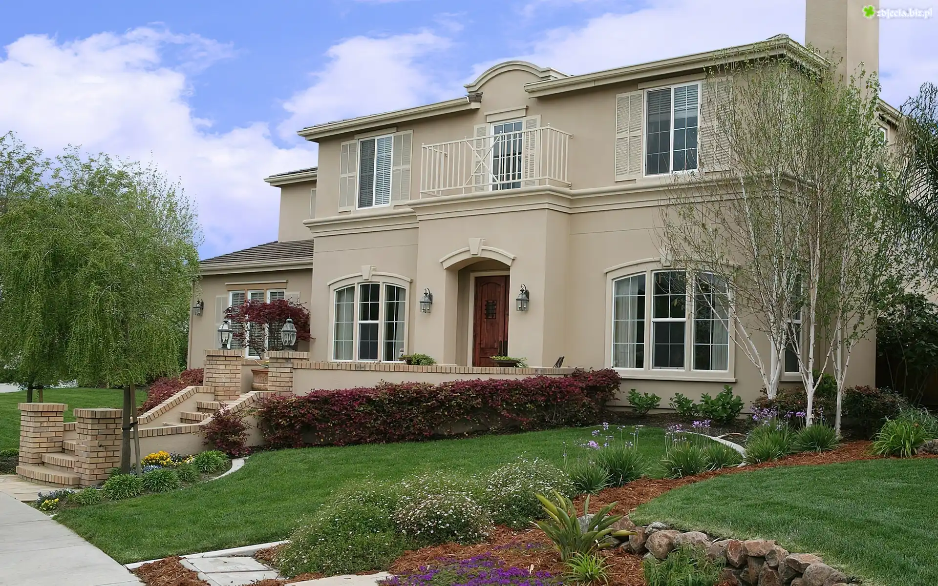 Zdjęcie Luksusowa, Willa, Kwiatki, Trawnik, Drzewka, Murek