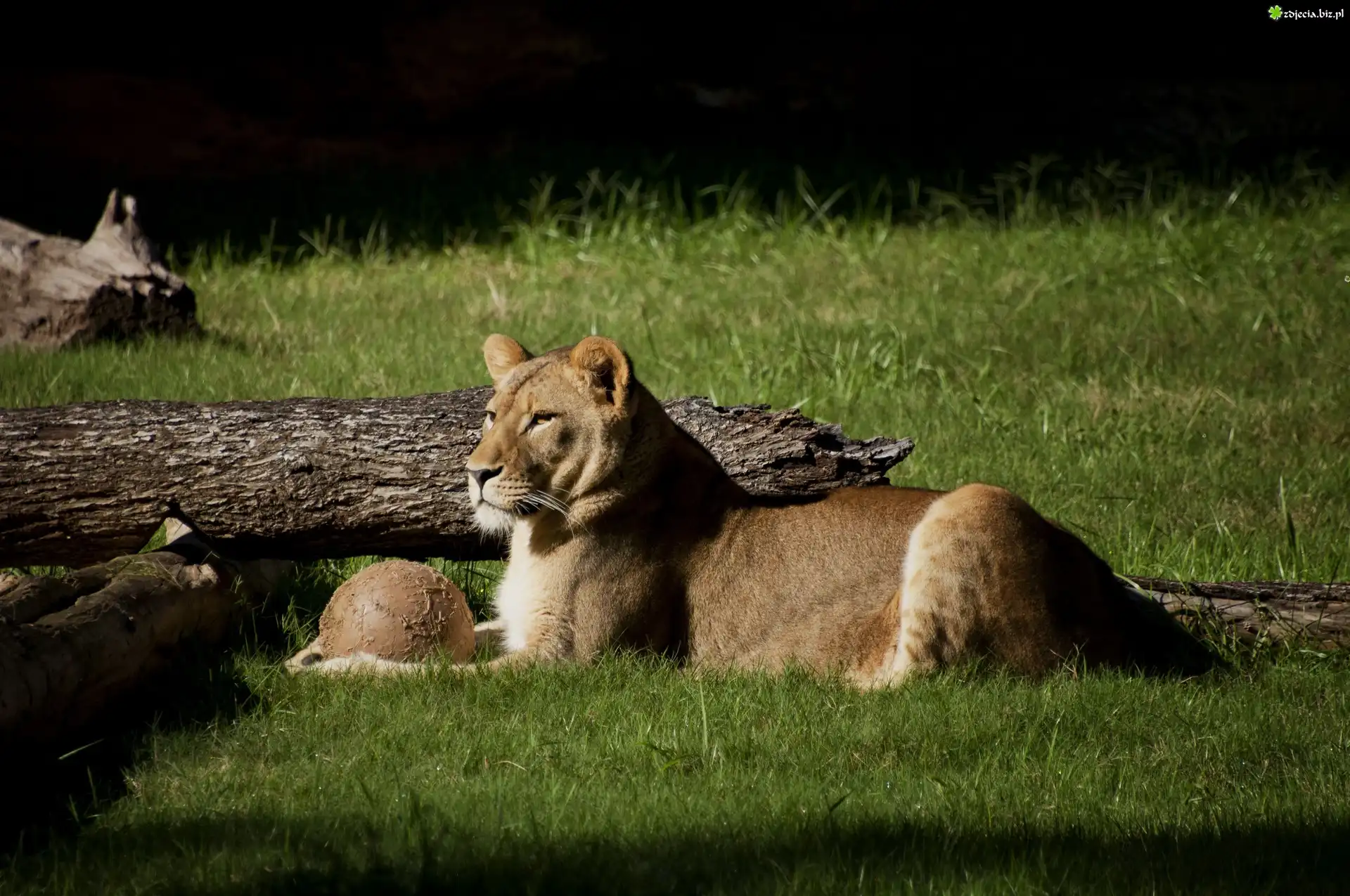 Zdjęcie Lwica, Piłka, Trawa, Konary, Drzew