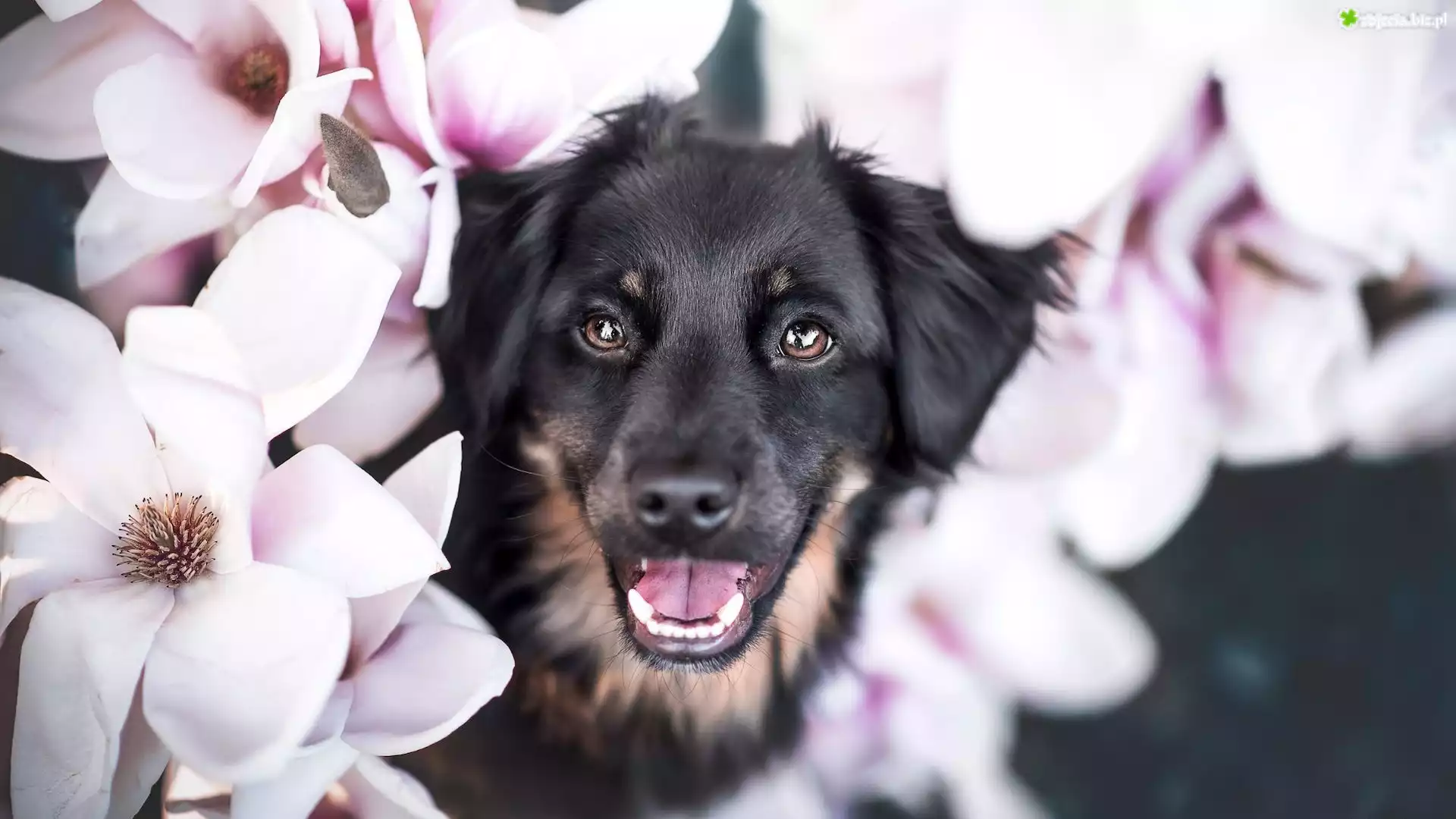 Zdjęcie, Pies, Czarny, Kwiaty, Magnolie