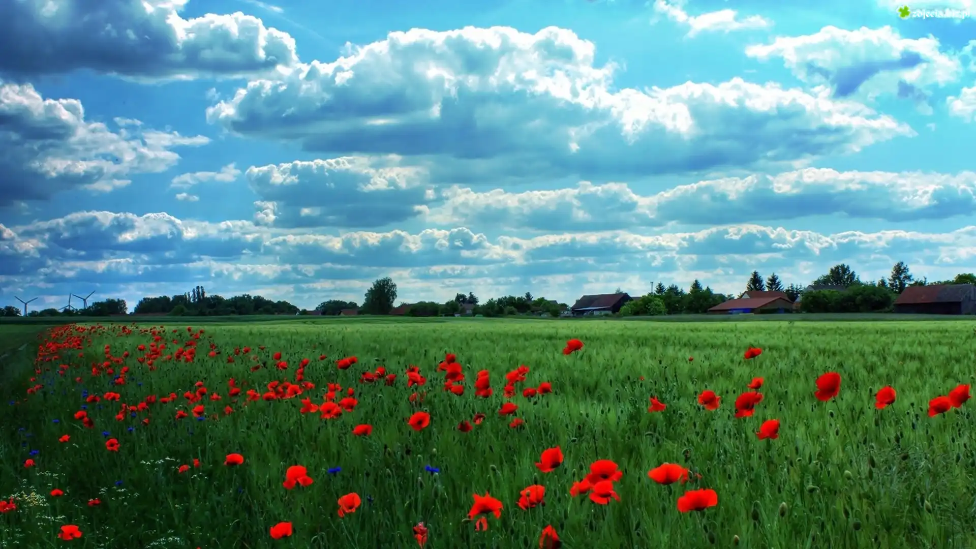Zdjęcie Pole, Maki, Farmy, Wiatraki, Chmury, Wioska, Krajobraz