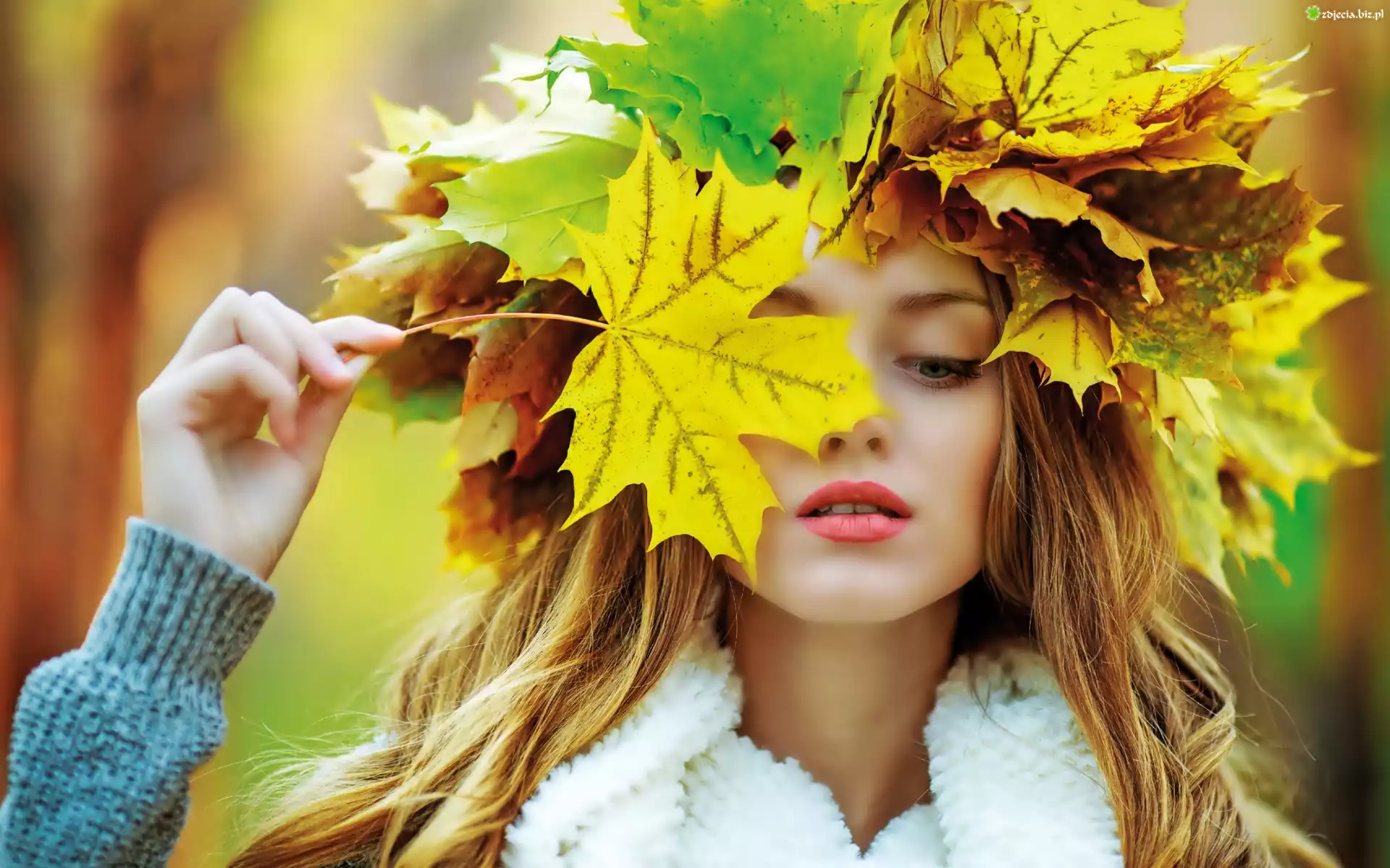 Zdjęcie Dziewczyna, Makijaż, Ozdoba, Z, Jesiennych, Liści, Park
