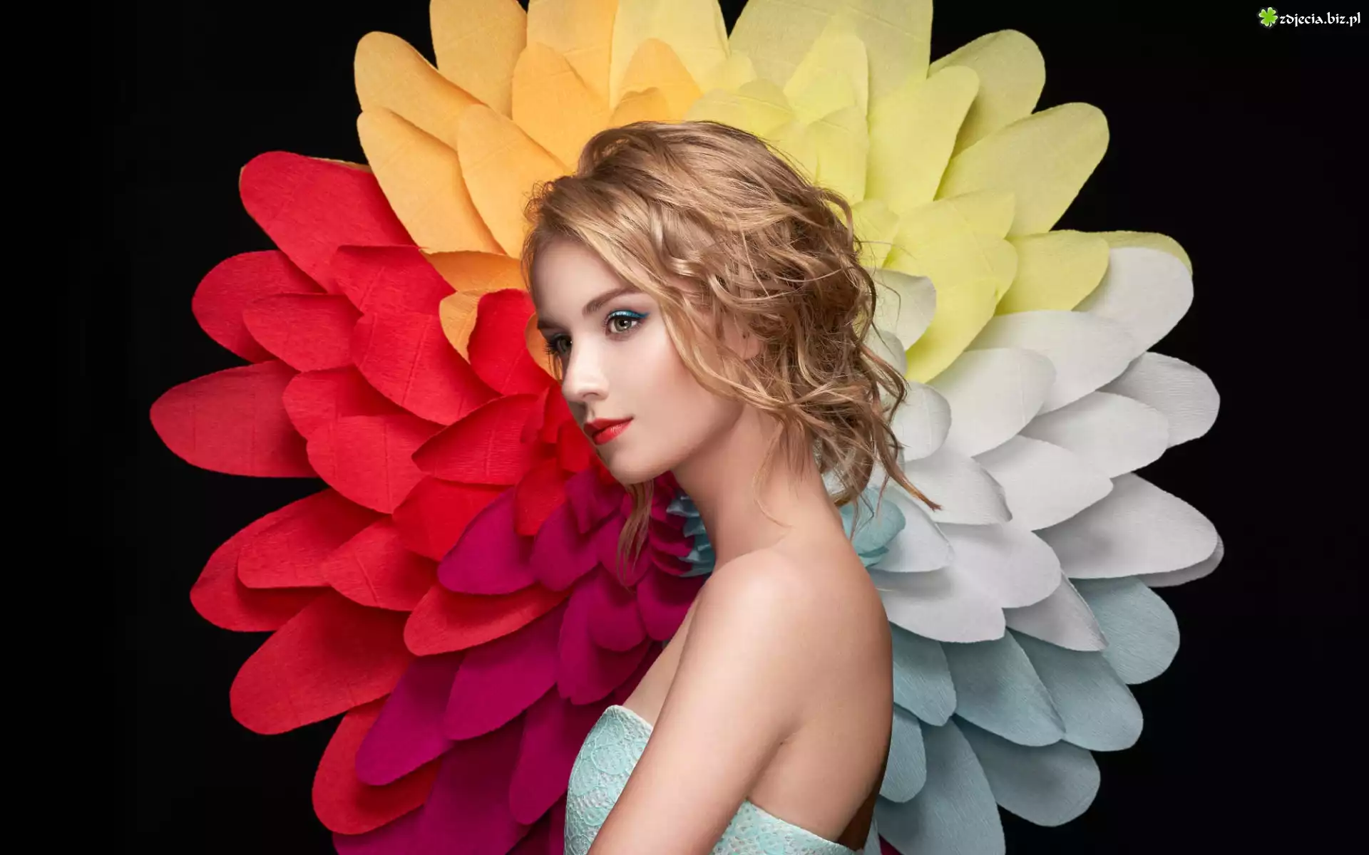 Zdjęcie Kobieta, Blondynka, Kwiat, Makijaż, Fryzura, Czarne tło